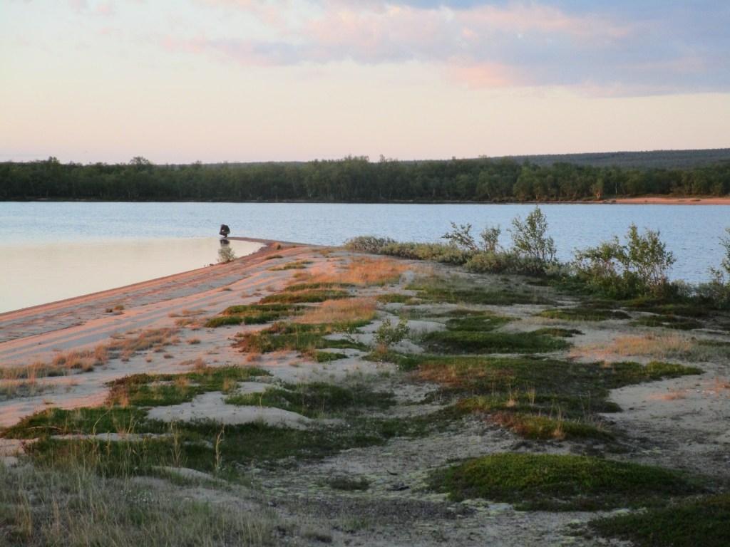 Vi våkner til en tiltakende varme. Jeg husker på Lars Monsens knep med å ta liggeunderlaget over seg, og ligge direkte mot den kjølende bakken. Vi gjør det og berger et par timers ekstra søvn. Til slutt står vi opp og setter over kaffekjelen. Lufta dirrer av et kraftig høytrykk som ligger trygt plassert over Kolahalvøya. Russevarmen ligger som et lokk over Nordkalotten. Dagens plan er å fiske oss nordover langs Vuottašjávris bredder, samt utforske nærliggende vann.