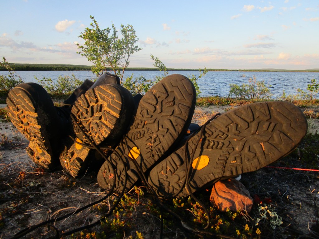 Vi slår leir. Setter opp teltet og igangsetter henting av ved til bålet. Vi tar sålene ut av fjellstøvlene og lar de ligge ute så de får tørket og luftet seg. Skyene har sprukket opp ut over dagen. Ikke et vindpust er å kjenne. Vannet ligger som et langstrakt speil foran oss. En lom høres i det fjerne.