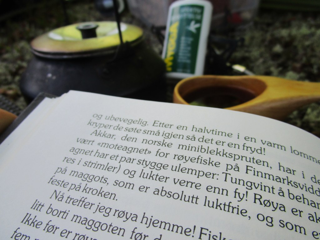 Etter at Kristian har hatt på land to gjedder, hvor den ene var av det grovere kaliberet, fyrer vi kaffebål ved bredden av et mindre vann. Tanken om vanskelig fiske har slått oss. Det er ikke gunstige forhold for haspelfiske slik det er nå. Vi må antagelig bare innstille oss på det. Østfisken pleier som regel å være mindre kresen på forholdene. Jeg lander også en fin abbor vi bruker i fiskesuppa, som utgjør dagens middag når vi kommer tilbake til leirneset. Sola går sakte ned mot horisonten når kveld går over mot natt. Bålrøyken stiger sakte til værs, men holder ikke myggen unna. Den jobben må klærne gjøre.