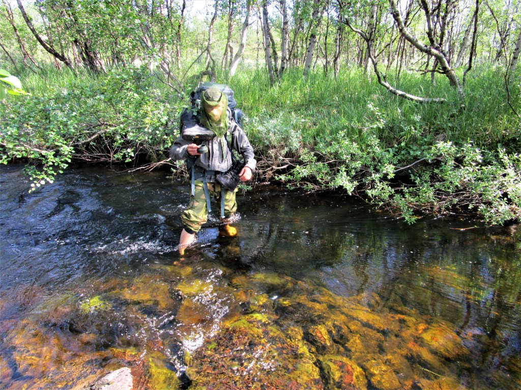 En enslig mann i en packraft-farkost padler rolig forbi midt utpå vannet idet vi begir oss videre inn over vidda. Vi vandrer oss oppover langs Áhkkanasjohka. For det meste greier vi å unngå de tette krattene, men det er ikke til å unngå at vi må slåss oss gjennom en del kjerr, og ikke minst myr på veien. Ett sted skal vi krysse elva, noe som fører til at undertegnede sklir overende midt utpå. Det fører til søkkvått kamera som fungerer sånn halvveis resten av turen. Ellers alt vel. Vi finner oss ny leirplass oppå en morenerygg, like inntil en vakker luoppal i elva. Her får jeg den eneste ørreten på turen. 250 gram. Været har nå stabilisert seg på omkring 30 plussgrader i skyggen på dagtid. Det er krevende. På grunn av myggen må vi holde oss påkledd. Og vi må drikke mye hele tiden. Søvnkvaliteten er det så som så med. Sola står opp på et tidspunkt de fleste definerer som natt. Det tar heller ikke lang tid før temperaturen inne i teltet blir tilnærmet uutholdelig. Ikke et vindpust er å kjenne.