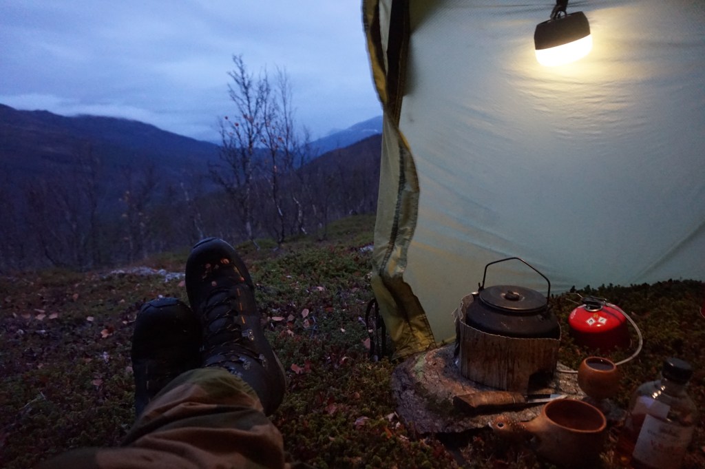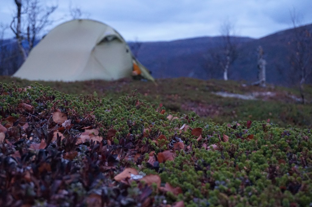 Idet teltet står oppreist på en lyngkledd hylle i terrenget, omkranset av kronglete bjørker og et par furutrær, tar jeg meg selv i å stå noen minutter og kikke ut over den sagnomsuste Dividalen som strekker seg ut foran meg. Kun noen få lys skimtes fra spredt bebyggelse nede i dalbunnen. Fra min trone av en leirplass kjenner jeg meg i noen sekunder litt som en konge.