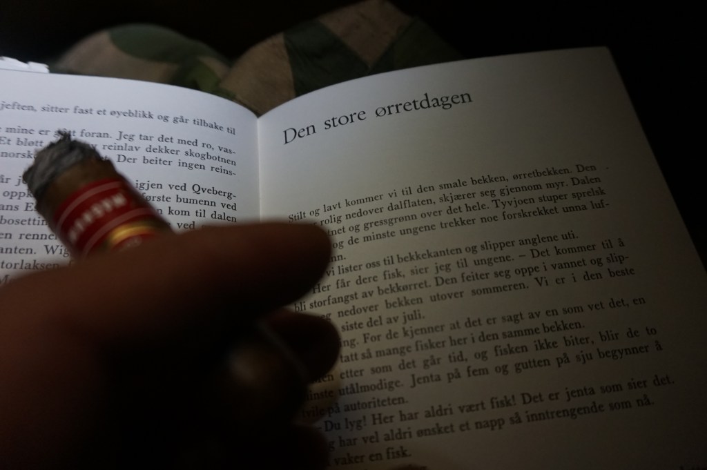 Klokken 0600 neste dag trekker jeg opp glidelåsen til ytterteltet og myser ut i mørket. Det er enda en stund til det er aktuelt å putte patroner i hagla. Derfor nytes en lang morgenstund i soveposen med å drikke opp en kjele kaffe, spise frokost og lese noen sider i ei bok jeg har lånt. «Der laks leker og fugl flyr» av Hans Kr.Eriksen. Fint lesestoff utgitt i 1970 om tregt friluftsliv i Nord-Norge.