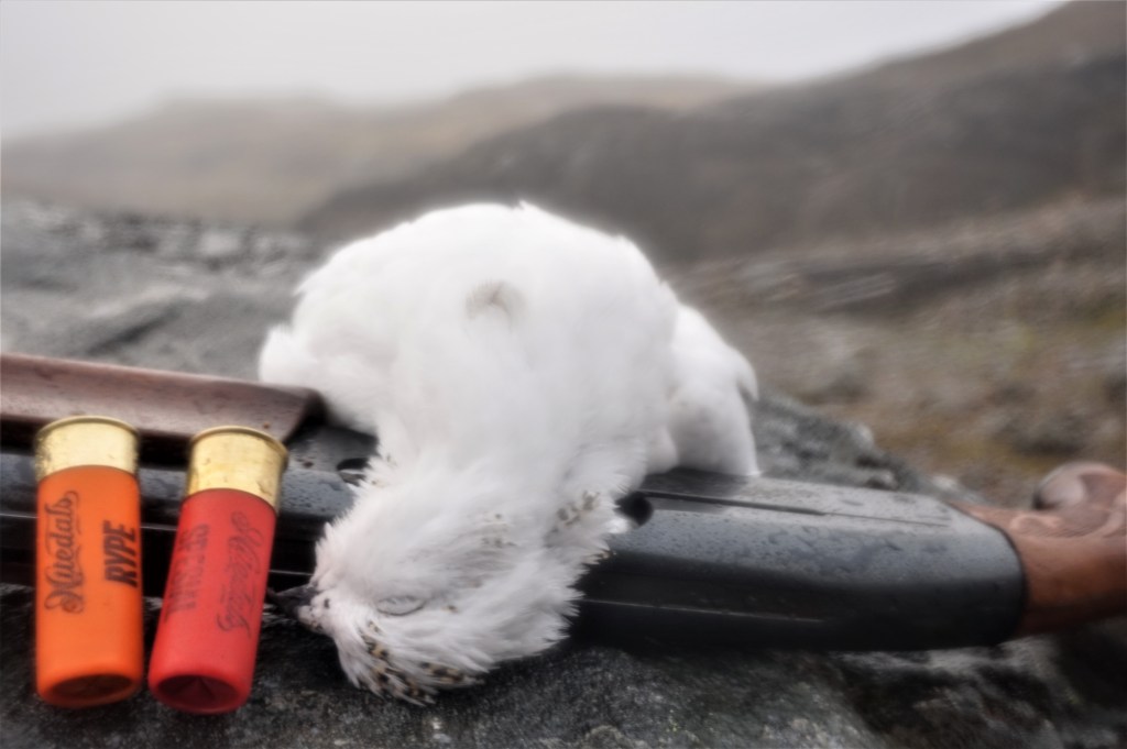 På vei tilbake går jeg gjennom noen av de fineste fjellrypebiotopene jeg har jaktet i. Jeg observerer kun noen fjær og litt avføring hist og her. Etter en liten stund kommer jeg til et avrundet berg. Nærmest som et svaberg ved kysten. Jeg går rundt det, og bråstopper idét jeg ser seks hvite bylter sitte 50-60 meter foran meg. Fjellrypene enser meg ikke. Jeg rygger tilbake, og gjør en omgående bevegelse oppover i terrenget, hvor jeg ser muligheten for å komme nærmere. Noe jeg også gjør. De siste meterene forseres på knær, før jeg reiser meg opp og feller ei sittende høne med et enkelt skudd på knappe 20 meter.