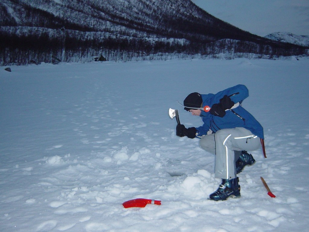 Mens rakettene dundrer som artilleri i det fjerne, står vi ute på isen og myser mot lysglimtene bakom fjellene. Til å være kystnært er det kaldt. Nærmere 15 minusgrader. Over oss funkler det i tusenvis av stjerner. Ved hjelp av en øks må vi banke opp hullene vi har boret med mitt splitter nye isbor. Rutinen med å isolere med snø lærte man på den måten.