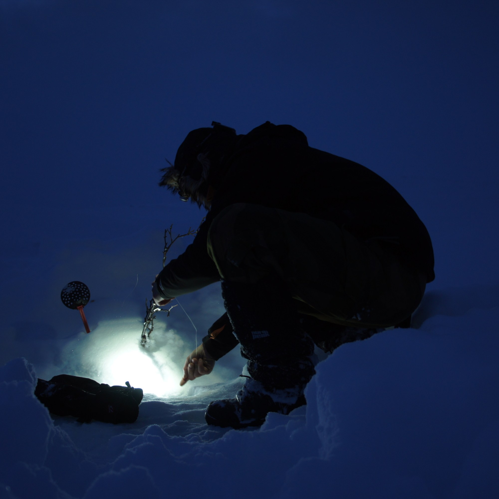 Når jeg med stunden har karret meg ut av teltet, må den flotte vintermorgenen få synke litt inn. Himmelen er tindrende klar og blå. Solen har klatret oppover i sin bane, og belyser allerede formasjonene med sine stråler. Jeg lar øynene vandre langs skråningene, mens jeg rusler de få meterne bort mot bjørkekvistene som er plassert over hvert sitt hull. Jeg kikker på firkanten av kvister uten å se bevegelse.
