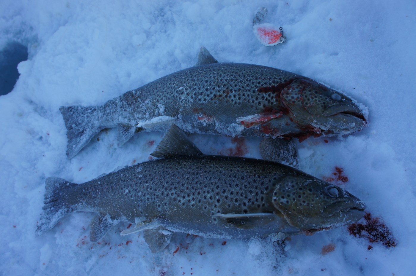 Med en aldri så liten skuffelse begynner jeg å renske hullet rundt hullet som er nærmest teltet, da kvisten kontant blir dratt ned like foran ansiktet mitt. På et øyeblikk fyker pulsen i været. Febrilsk fjerner jeg resten av den isolerende snøen fra vannet, og begynner å trekke opp. Meter for meter. Tyngden på fiskens bevegelser forteller meg at dette må være bra størrelse. Spenningsnivået er derfor høyt når jeg får fiskens hode i hullet, og trekker den opp på isen. En fantastisk fin vinterørret ligger foran meg, maken har jeg knapt sett. På denne tiden av året og med en kondisjon som tilsier at dette er en fisk som åpenbart lever livets glade dager i matfatet året rundt. Vekta viser 1,3 kilo. Og mens jeg har arbeidet med å lande denne fabelaktige skapningen, har jeg ikke merket at det har gått på en til på ett av de andre snørene. Denne landes også, og veier rett under kiloet. Like rund og bred over ryggen som den første. Himmelfallen egner jeg krokene på nytt og senker de ned i mørket.