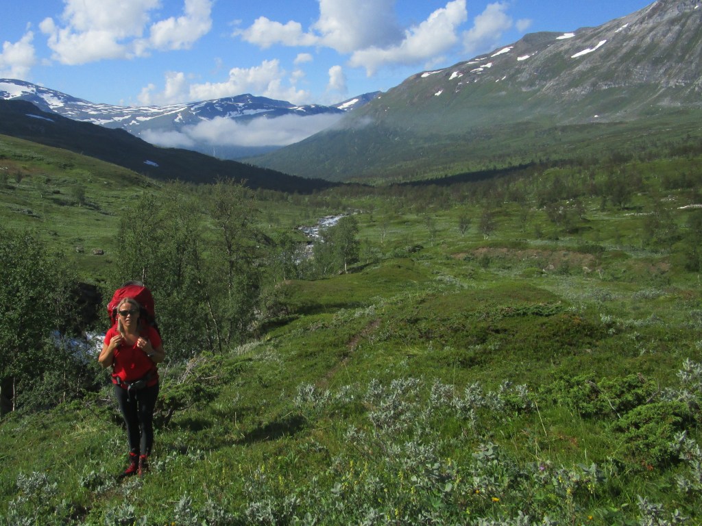 Det går jevnt og seigt oppover. Min søster går først idét vi beveger oss inn i den tette tåken, som ligger som et belte langsmed de øverste strekkene av bjørkeskog. Over tåken skinner solen fra lettskyet himmel. Blandingshunden Frøya er med på en av sine første lengre turer. Lettbent jogger hun frem og tilbake, stadig snusende og utforskende på unghundvis, hele tiden i nærheten av oss. Et stykke unna kan lyden av en brusende elv høres idét den stuper nedover fra fjellskaret og mot den dype dalen.