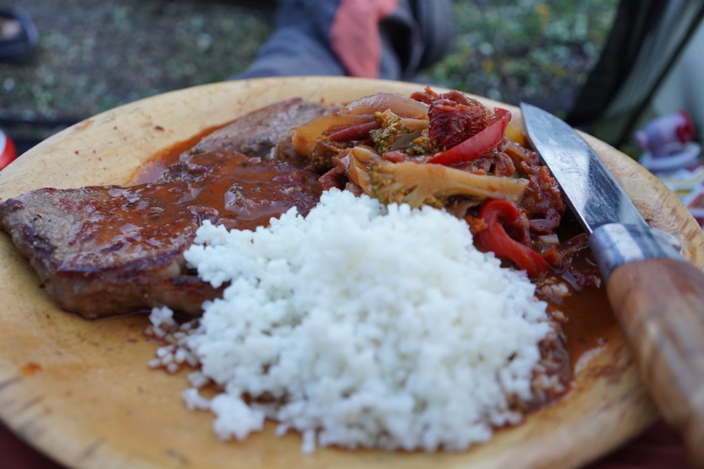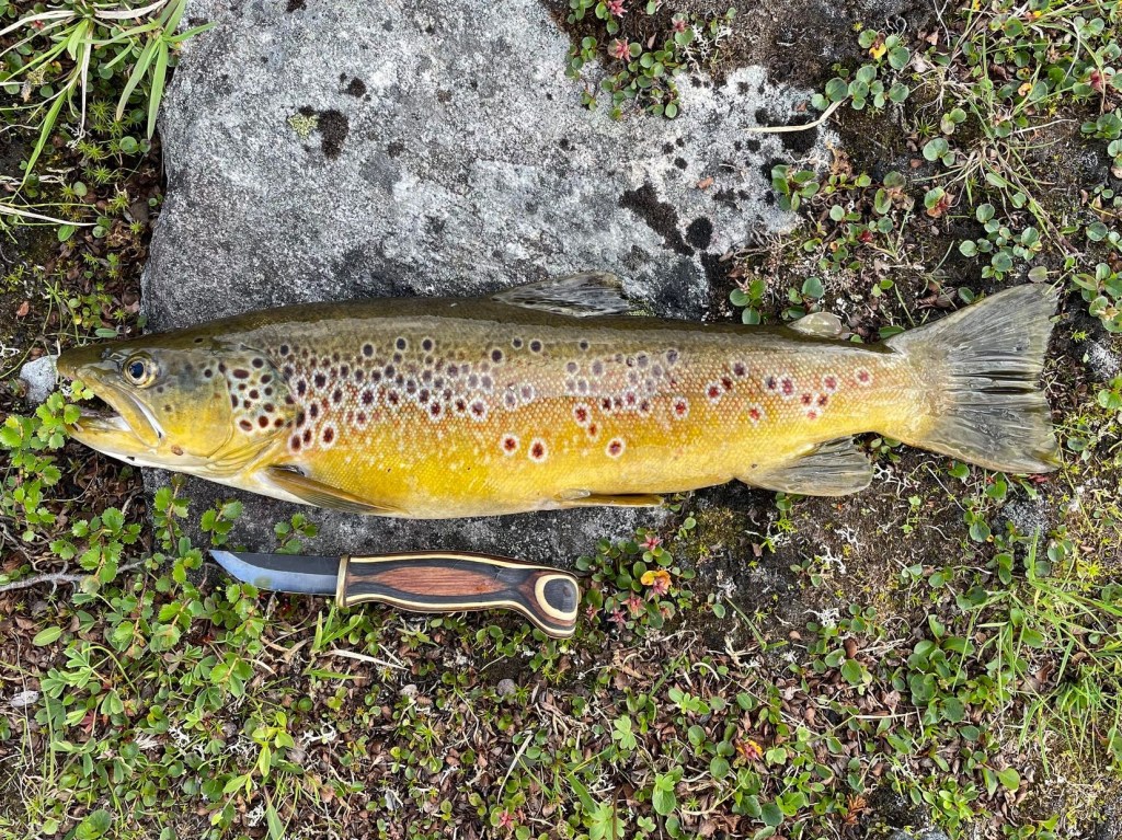 Første fiskerunde utpå tidligkvelden gir resultat i form av at Sunniva med sølvsluk lander en rund og fin ørret på tett under 600 gram. Med krepsdyret gammarus i magesekken borger det for gode forhold under vannflaten. Fra et lite nes like ved kunne med stunden også jeg kjenne motstand i enden av snøret. En slank gammel sliter over middagshøyden endte etter en kort kamp i håven. I sine velmaktsdager ville den nok holdt en vekt på rundt 2 kilo. Med en enkelkrok festet i underkjeven føltes det greit å la den gå ut i vannet igjen, og innta sin pensjonisttilværelse. Det er svært unntaksvis jeg gjør dette, men som matfisk var den ikke prima. Vi jages inn av en ny intens og kortvarig regnbyge, og imøtegår kvelden videre med en fantastisk biffmiddag på gassbrenneren. Herremåltidet ble så etterfulgt av Sunnivas fenomenale hjemmelagede multebærlikør. Litersflasken med det magiske brygg fikk saktens føtter å gå på.