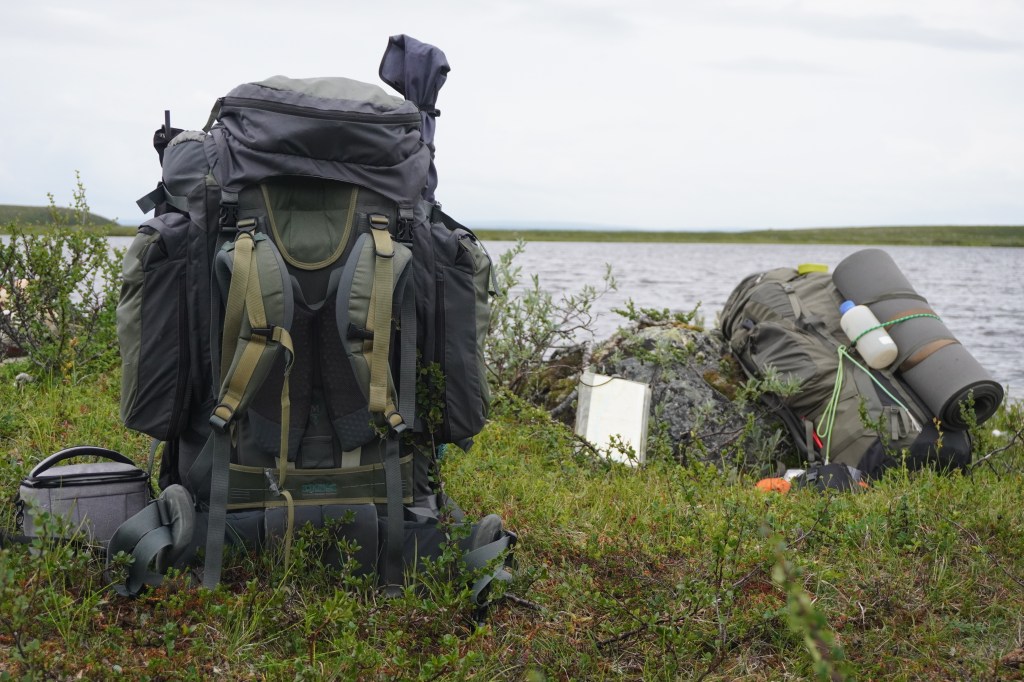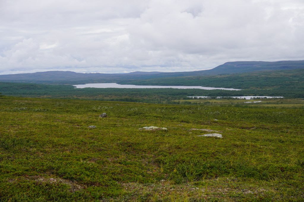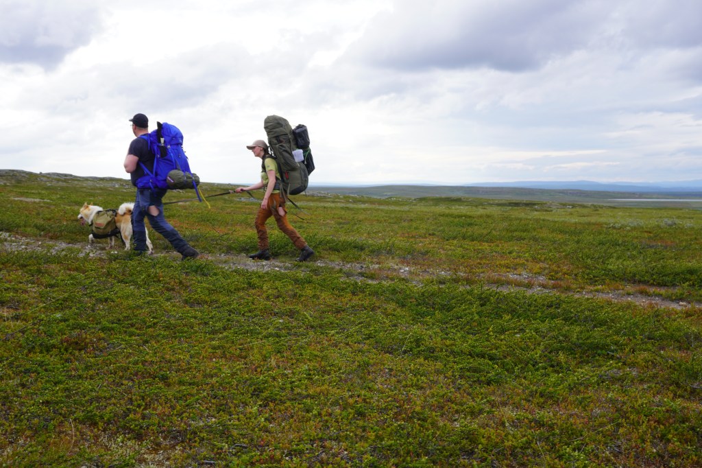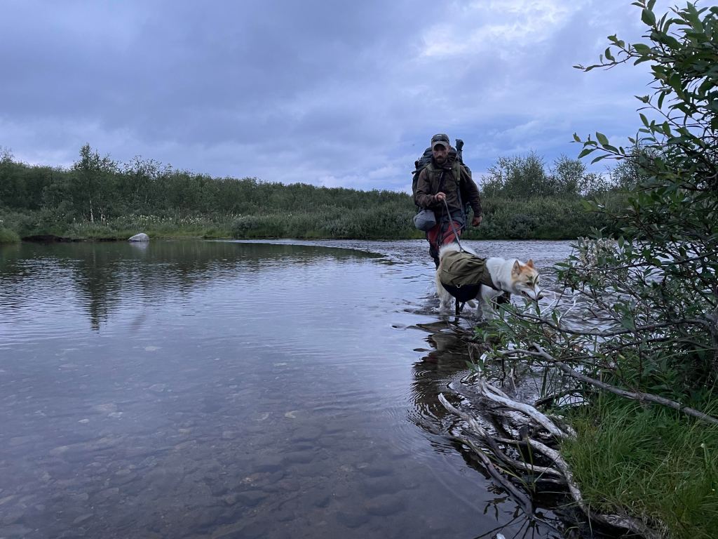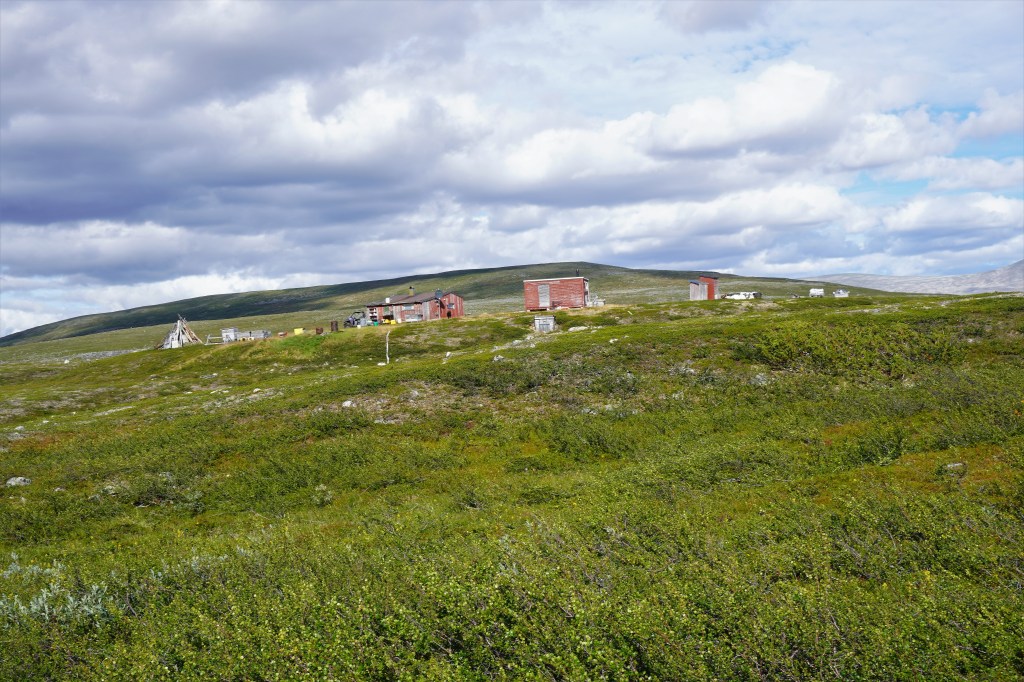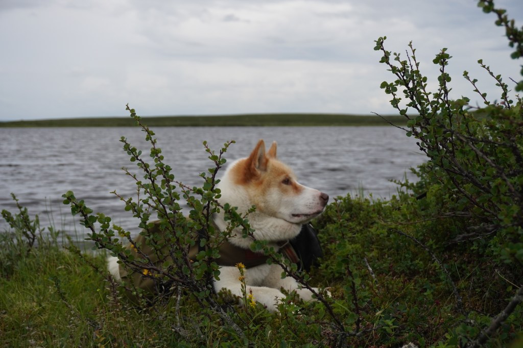 På fjerde dag nærmere halv seks på ettermiddagen, etter omtrent fire timers vandring, trasker vi inn over den flate moreneryggen inntil et mektig fjellvann. Vi har lagt oss til i nordenden, med utsikt over vannet tilbake der vi kom fra. Like ved klukker innløpsoset, kledt inn i en buktende slange av mannshøyt vierkratt. Langs ruten passerte vi synlige kulturminner i steinuren etter den gamle nomadiske virksomhet. Kan hende et gammelt kjøttlager ut fra formen å vurdere. Vi har også rukket å krysse et par fjellelver med betydelig vannføring etter det siste halvannet døgn med tidvis intenst regnvær. Det har nå klarnet opp, og vi nyter tilværelsen med fiske og bærplukking. Sunniva finner tilstrekkelig multer slik at vi har for en solid frokost neste dag. Utpå kvelden brummer det i lavfrekvent motordur i fjellet over oss, og vi får besøk av en trivelig reineier fra Karasjok. Han blir sittende hos oss en god stund, og kan mellom annet fortelle at de er tre karer som for tiden bedriver en del arbeid med fornying av et merkegjerde de har litt lengre nord. Med seg har han også en liten skøyer av en gjeterhund, god gammel gatemiks slik som normen er for lappenes bikkjer. På småkjeltringvis forsøker den å nappe til seg litt av grønlandshundens mat, noe sistnevnte ikke er overvettes begeistret for. Men eieren har fin kustus på den unge bastard, og det er moro å se hvordan han håndterer den. Vi har for øvrig besluttet videre forflytning neste dag.