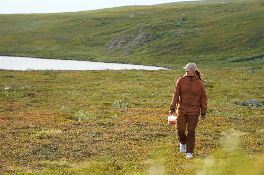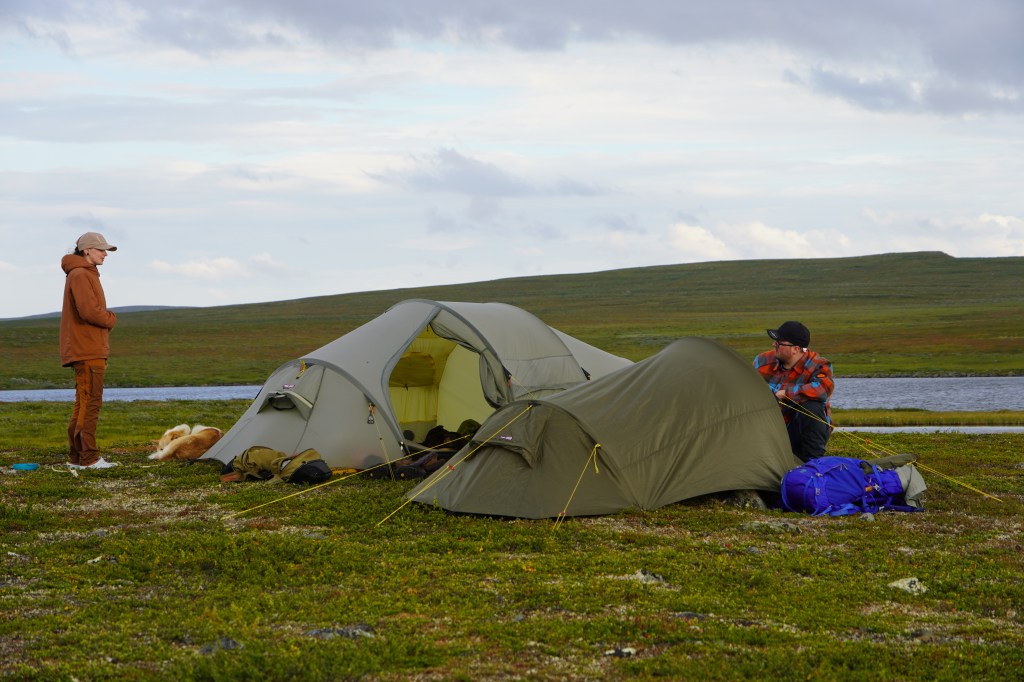 Tre par fjellstøvler og et potesett har nå tråkket seg i knappe tre timer fra de innerste deler av Tverrelvdal ved Alta. Det er min samboer Sunniva, hennes bror Ole, grønlandshunden Likka og undertegnede. Vi befinner oss mellom to mindre vann, bundet sammen av et sildrende bekkefar. Rundt oss har vi flere større, velkjente fiskevann. Falkvann, Tvillingvann, Langvann og Urvann er navngjetne for sine rike bestander av stor fjellfisk. På en tørr morenerygg finner vi plass til våre to nylonboliger. Like før vi ankom hit ble vi truffet av en flyktig lokal regnbyge, som på kort tid rakk å bløtlegge oss tilstrekkelig. Men den varme vind sørger nå for god tørk idét pluggene står i jorden, og min høstingsivrige samboer kan observeres i godt driv med multebærspannet over de nærmeste myrdragene.