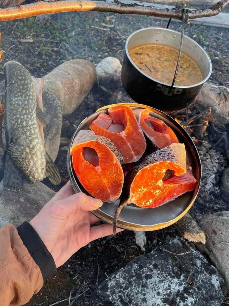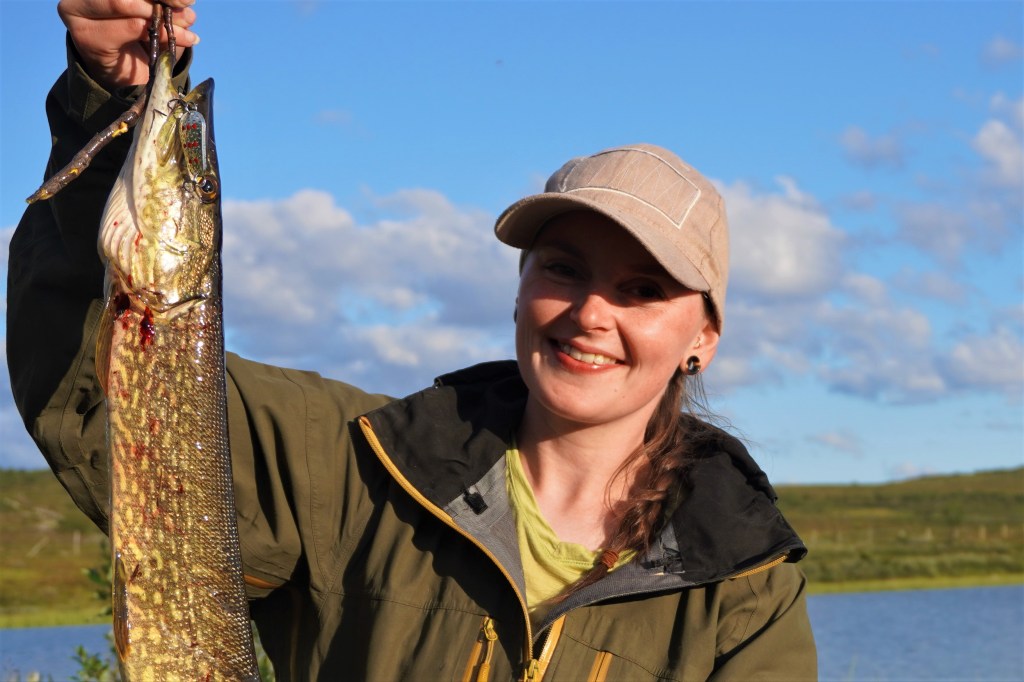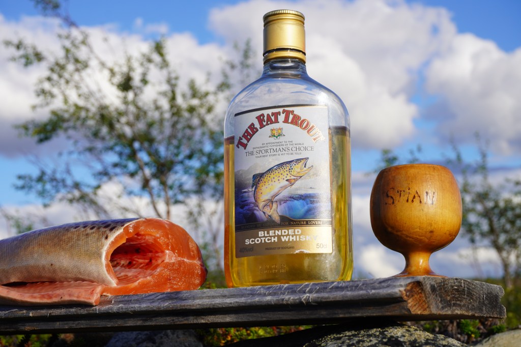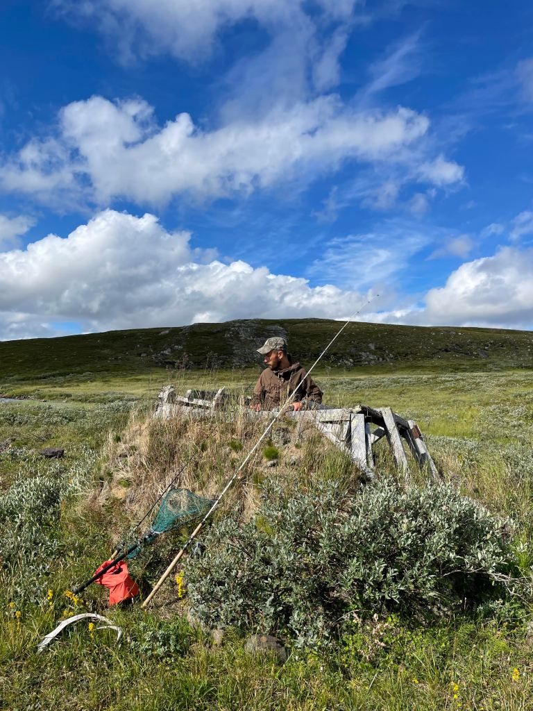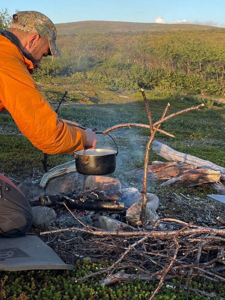 Fiskemessig skulle dette vise seg å være et interessant sted. Etter at vi har slått opp leirplass rigger jeg stangen og rusler ned til dammen for å ta noen kast. På forhånd var vi av samene blitt advart om en rikholdig bestand av «hávga» her, men at det også kunne slenge fin ørret. I eldre tider pleide de å garnfiske her, noe som mellom annet holdt gjeddebestanden i sjakk. Men nå hadde den grønnbleke urfisk fritt leide. Det var derfor med litt blandede forventninger at jeg satte i gang fisket. Etter en liten stund drar det kraftig til i enden av snøret. Jeg står i en bukt, med en liten sandbanke omkranset av siv, og gjedde er det første som slår meg. Brutalt kjører jeg inn den sterke fisken, og oppnår raskt økt puls idét jeg konstaterer at det ikke er gjedde. Jeg tauer fisken kontant inn over sanden, kakker den i skallen og anroper Sunniva som befinner seg oppe ved teltet. Dette er en av de fineste ørreter jeg noen sinne har fått. Kulerund kropp, korte finner og lite hode. Bred som en knyttneve over ryggen, og knappe halvannet kilo på vekta. Inspirert av fangsten gjør også Sunniva en fiskerunde, med to gjedder på land som resultat. Hennes første noen sinne av arten. Vi lar dagen renne ut med en asiatisk inspirert fiskesuppe på ørreten og en fantastisk stund ved bålet med vin og whisky.