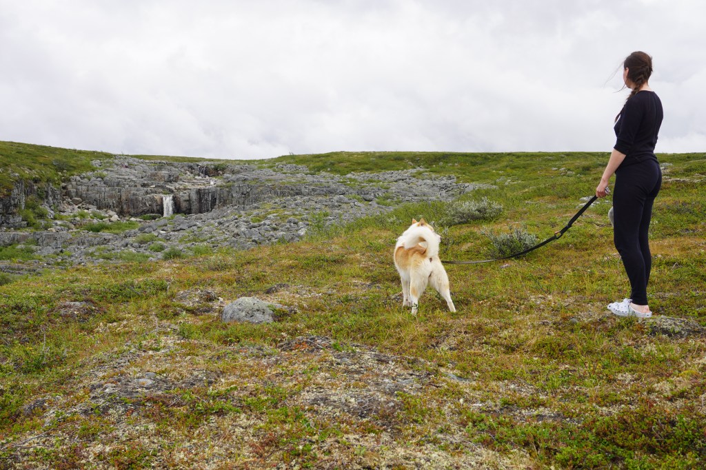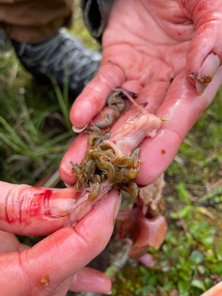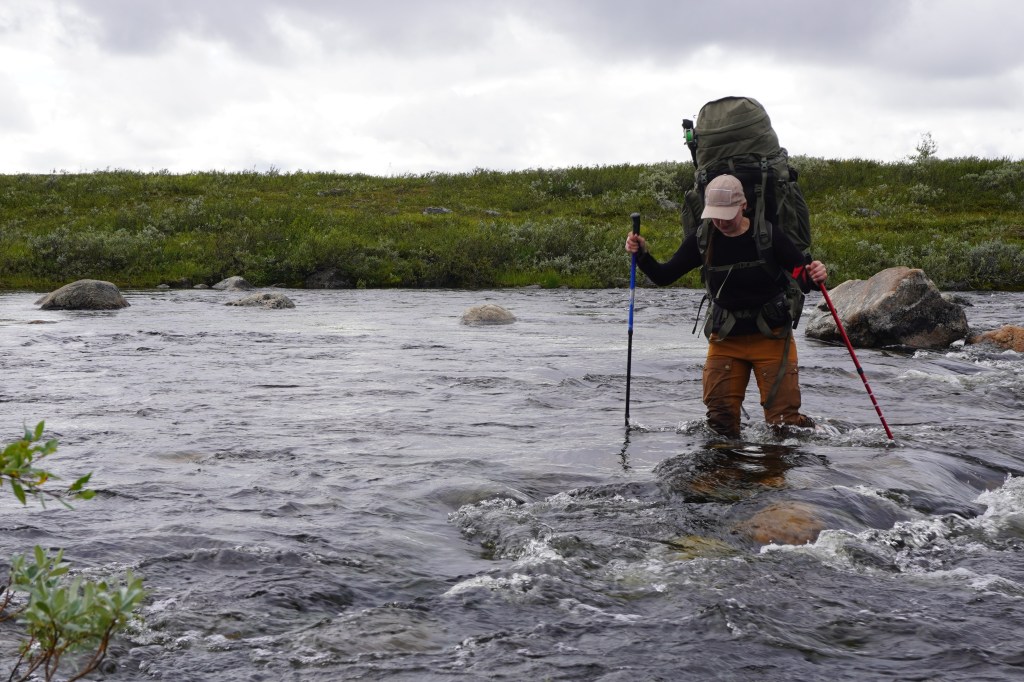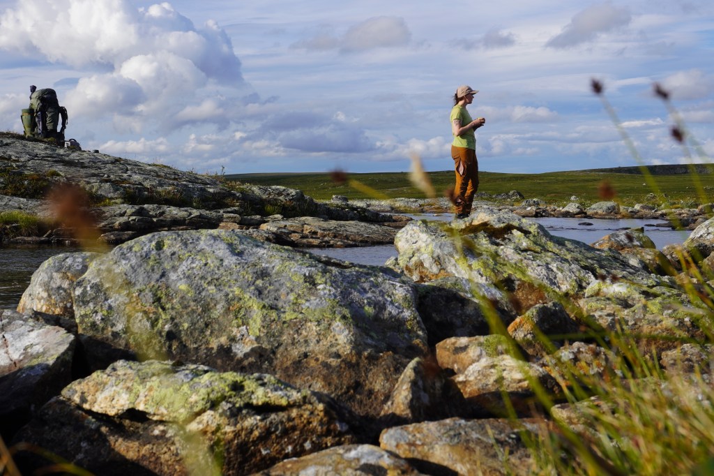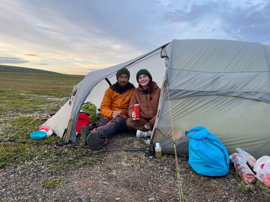 Fiskemessig skulle dette vise seg å være et interessant sted. Etter at vi har slått opp leirplass rigger jeg stangen og rusler ned til dammen for å ta noen kast. På forhånd var vi av samene blitt advart om en rikholdig bestand av «hávga» her, men at det også kunne slenge fin ørret. I eldre tider pleide de å garnfiske her, noe som mellom annet holdt gjeddebestanden i sjakk. Men nå hadde den grønnbleke urfisk fritt leide. Det var derfor med litt blandede forventninger at jeg satte i gang fisket. Etter en liten stund drar det kraftig til i enden av snøret. Jeg står i en bukt, med en liten sandbanke omkranset av siv, og gjedde er det første som slår meg. Brutalt kjører jeg inn den sterke fisken, og oppnår raskt økt puls idét jeg konstaterer at det ikke er gjedde. Jeg tauer fisken kontant inn over sanden, kakker den i skallen og anroper Sunniva som befinner seg oppe ved teltet. Dette er en av de fineste ørreter jeg noen sinne har fått. Kulerund kropp, korte finner og lite hode. Bred som en knyttneve over ryggen, og knappe halvannet kilo på vekta. Inspirert av fangsten gjør også Sunniva en fiskerunde, med to gjedder på land som resultat. Hennes første noen sinne av arten. Vi lar dagen renne ut med en asiatisk inspirert fiskesuppe på ørreten og en fantastisk stund ved bålet med vin og whisky.