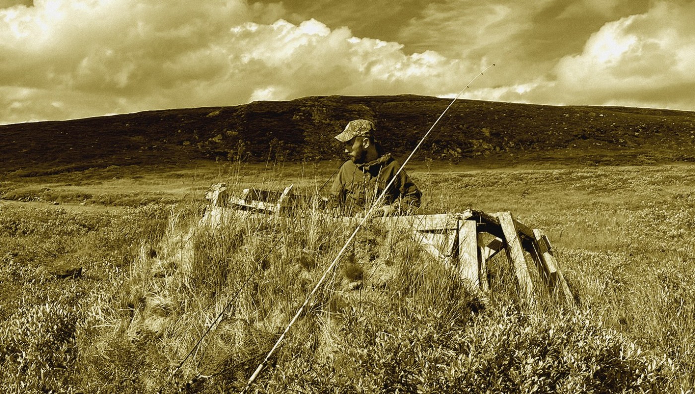 Tre par fjellstøvler og et potesett har nå tråkket seg i knappe tre timer fra de innerste deler av Tverrelvdal ved Alta. Det er min samboer Sunniva, hennes bror Ole, grønlandshunden Likka og undertegnede. Vi befinner oss mellom to mindre vann, bundet sammen av et sildrende bekkefar. Rundt oss har vi flere større, velkjente fiskevann. Falkvann, Tvillingvann, Langvann og Urvann er navngjetne for sine rike bestander av stor fjellfisk. På en tørr morenerygg finner vi plass til våre to nylonboliger. Like før vi ankom hit ble vi truffet av en flyktig lokal regnbyge, som på kort tid rakk å bløtlegge oss tilstrekkelig. Men den varme vind sørger nå for god tørk idét pluggene står i jorden, og min høstingsivrige samboer kan observeres i godt driv med multebærspannet over de nærmeste myrdragene.