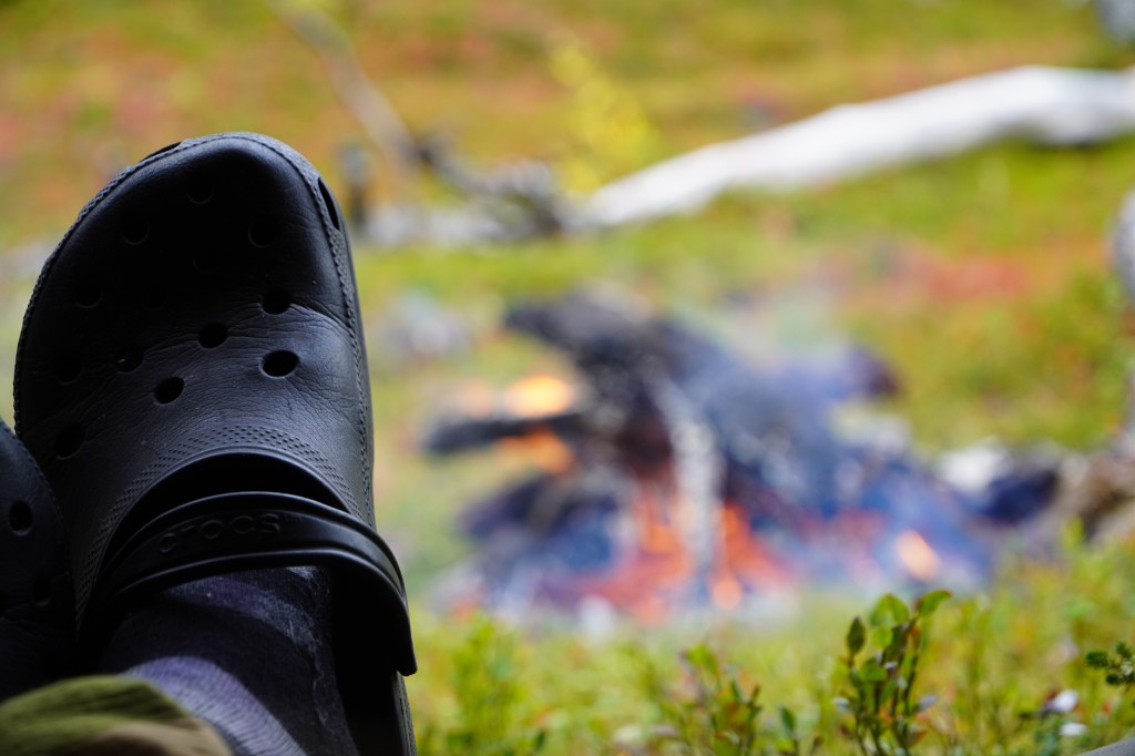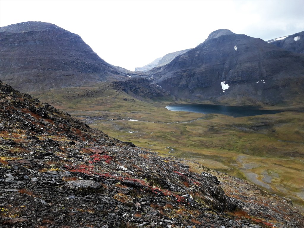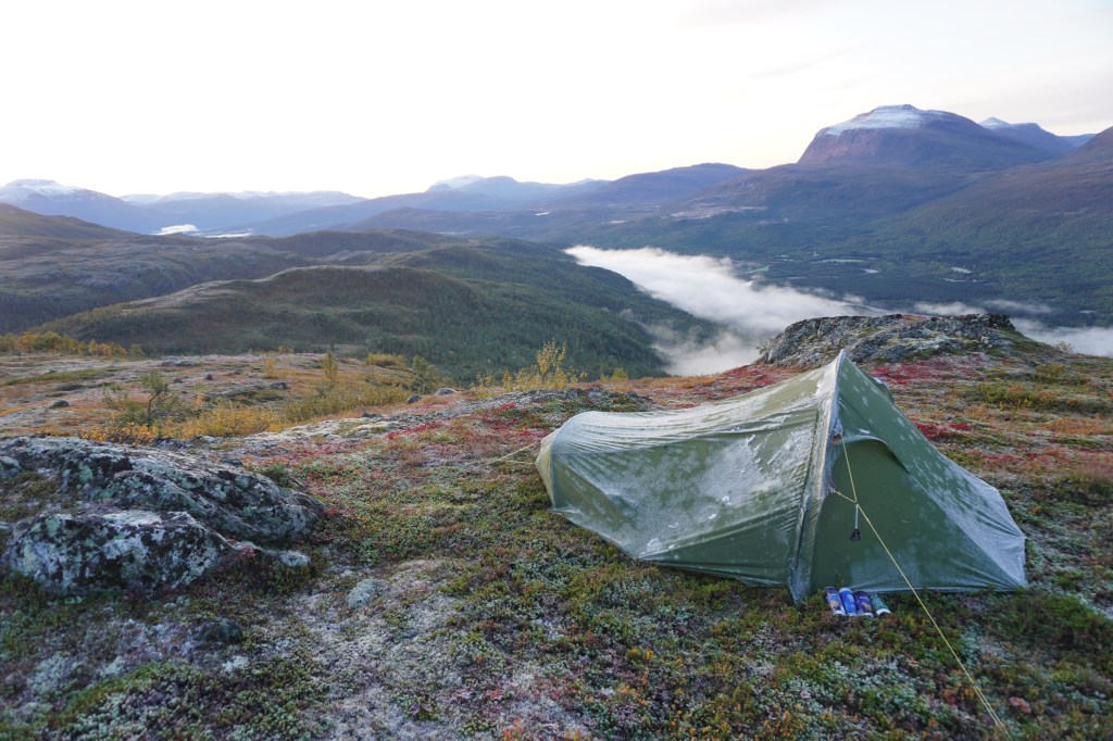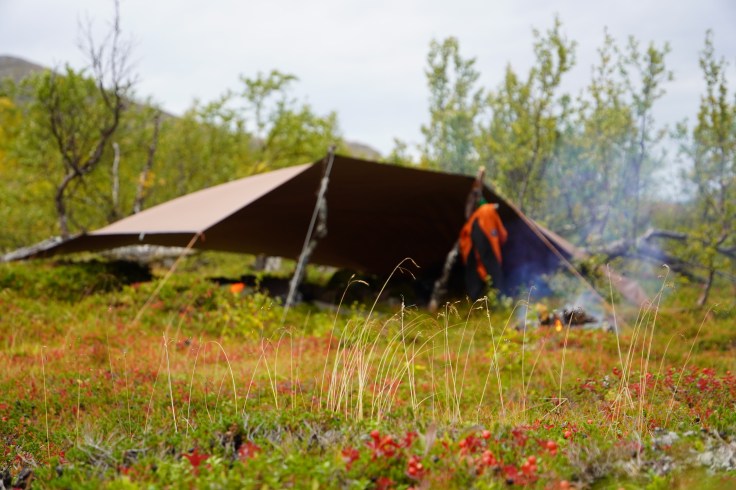 Usedvanlig frisk i fraspranget i dag. Det er motivasjonsrelatert. Innmarsjtraséen går hovedsaklig langs et tråkk oppover den skogkledte li, før jeg brekker av mot de ruvende massene av sønderknust stein. Ved foten av den siste morenerygg må en reflektere over de kolossale krefter som ble utløst for 10 000 år siden. De veldige moreneryggene består av tusenvis på tusenvis av tonn grus og stein, som har blitt malt opp under enorme krefter av is og vann. Jeg har min faste leirplass i dette området på en hylle beliggende inn mot den brusende elven som renner nedover mellom moreneryggene. Her er det tørr lyng, krokete fjellbjørk og rikelig med brensel rundtom.