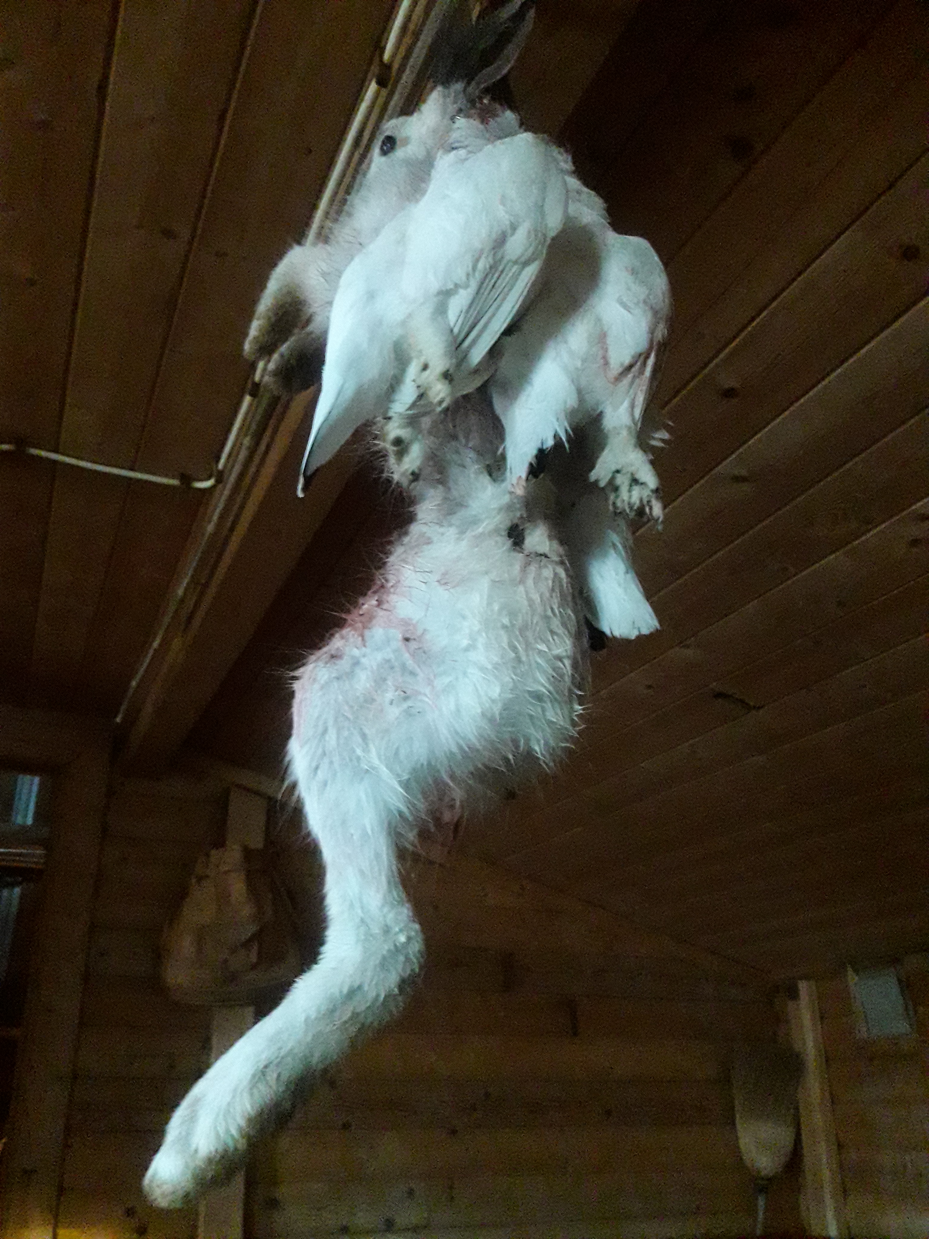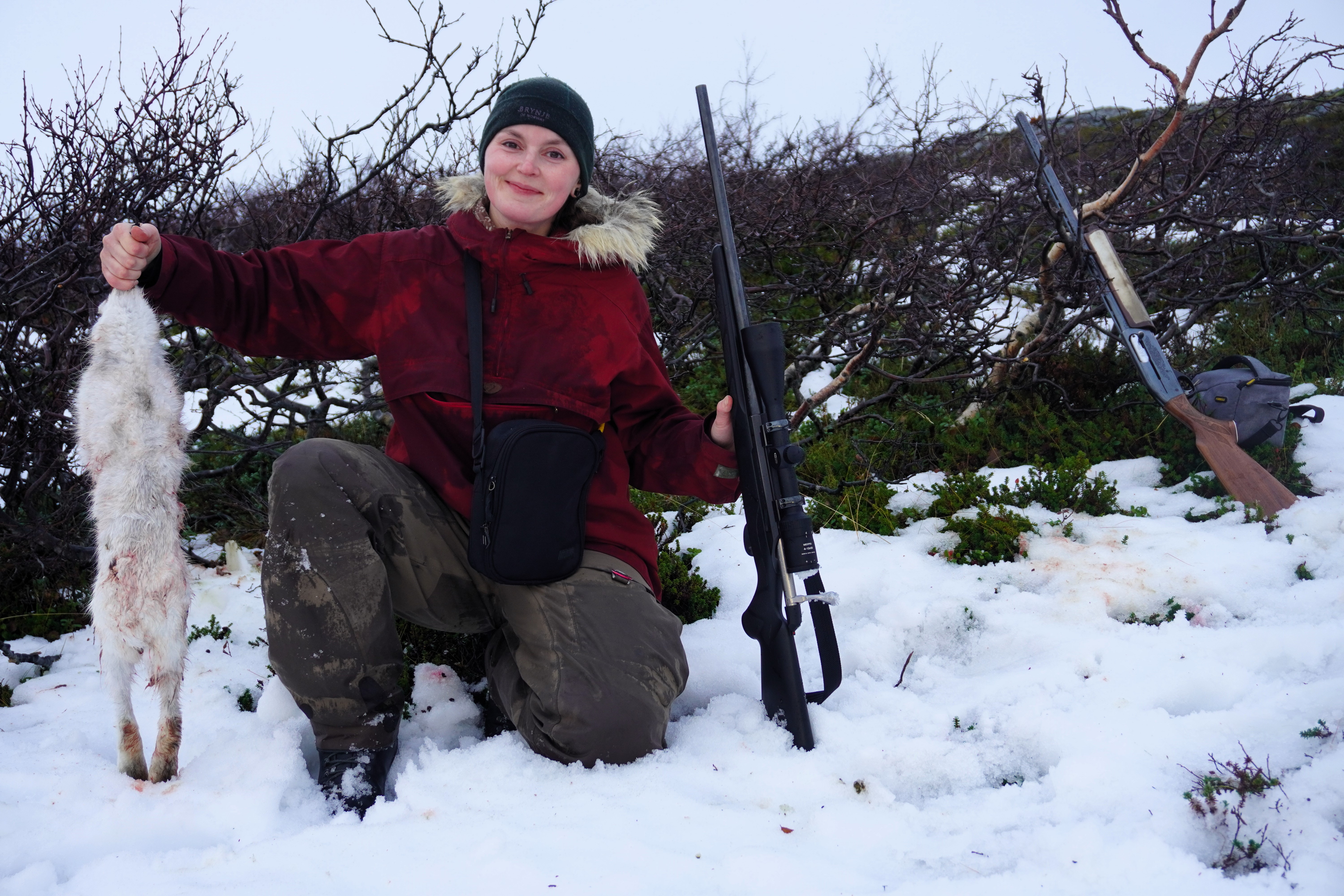 Dagens fangst blir i form av en hare, som vi finner i et område med lavt bjørkekratt. På relativt kort hold er den et kurant mål gjennom kikkertsiktet, og Sunniva lar skuddet falle. Prosjektilet tar seg av både avlivning og utvomming på en gang. Men kjøttet berges fint. På tampen av dagen forsøker vi oss rundt noen granfelter, der harene spretter frem som hvite prosjektiler mellom alt det mørkegrønne. Etter et par bomskudd med hagle senere, og noen skudd som ikke kunne avfyres pga nærhet til bebyggelse, avslutter vi. Det er nå dags for å hvile slitne ben, og returnere til det gamle småbruket der vi er makelig innlosjerte i en flott gammel fjøs.