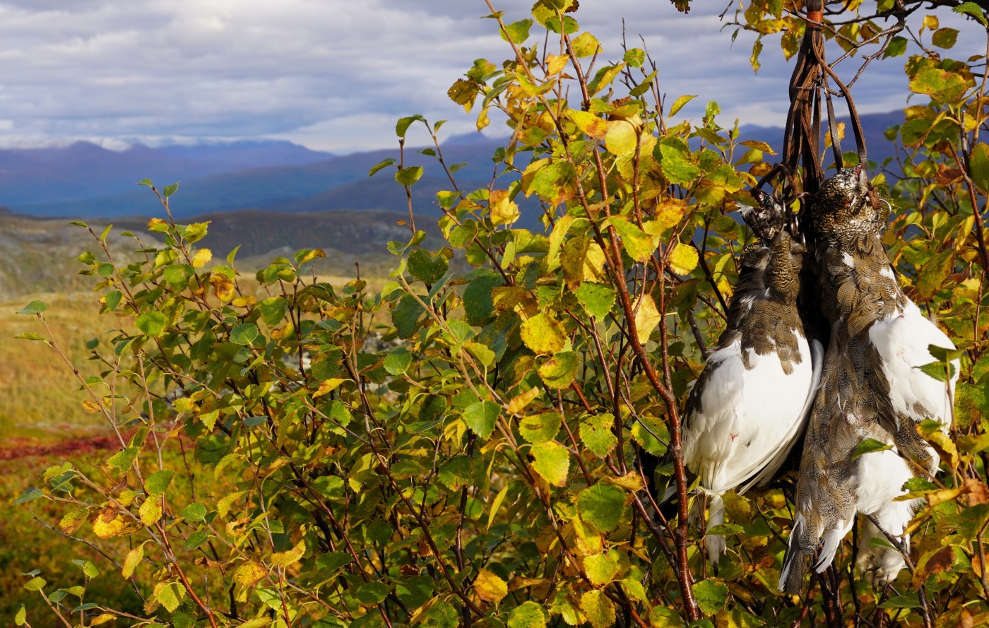 Jeg vandrer videre. Gjennom et parti av fjellet jeg ikke anser som særlig til leveområde for fjellets fugl. Klyver så opp over nye fjellrygger. Den sterke vind gjør seg fortsatt gjeldende, og avtar ikke før jeg kommer i le av en bratt tind på nærmere 1200 høydemeter. Omsider finner jeg nye ryper, men de er lette på vingene. Flyr hit og dit, uten at jeg kommer på hold. Og jeg har konkurranse om viltet i dag. To jaktende falker kommer susende fra stor høyde gjennom luften før de brått stanser opp og slår med vingene mens de holder seg helt i ro. Hodet vender hit og dit, speidende etter bytte. Dette er luftens overlegne akrobater. Langt dyktigere og raskere flyvere enn fjellrypen. Flere ganger ser jeg falkene i løpet av denne jaktturen. Og heldigvis ser jeg også flere ryper, hvorpå to nye faller for haglesvermen. Den ene en modig stegg som etter 20 meters luftferd satte seg på en sten og rapte høylytt. Det ble dens bane. Resten av kullet forsvant.