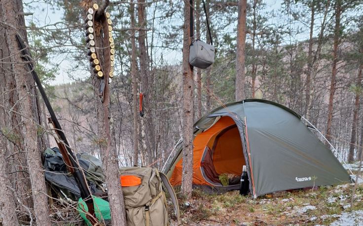 Løvet har gulnet rundt meg. Insektene er borte. Luften er frisk og tindrende klar. Den første frost har gjort seg gjeldende over det myke teppet av mose og lyng som kler Målselvdalens sørlige flanker. På en liten bortgjemt hylle høyt oppe i terrenget brenner bålet. Skaper konsentrert varme og kaster et forheksende lys inn under duken som er spent ut mellom fjellbjørkene. Jeg strekker ut mine ben og spretter en boks øl etter et godt måltid. Haglegeværet står oppreist mot bjørkeleggen, og patronbeltet henger på en kvist. Det er jakttid igjen i indre Troms.