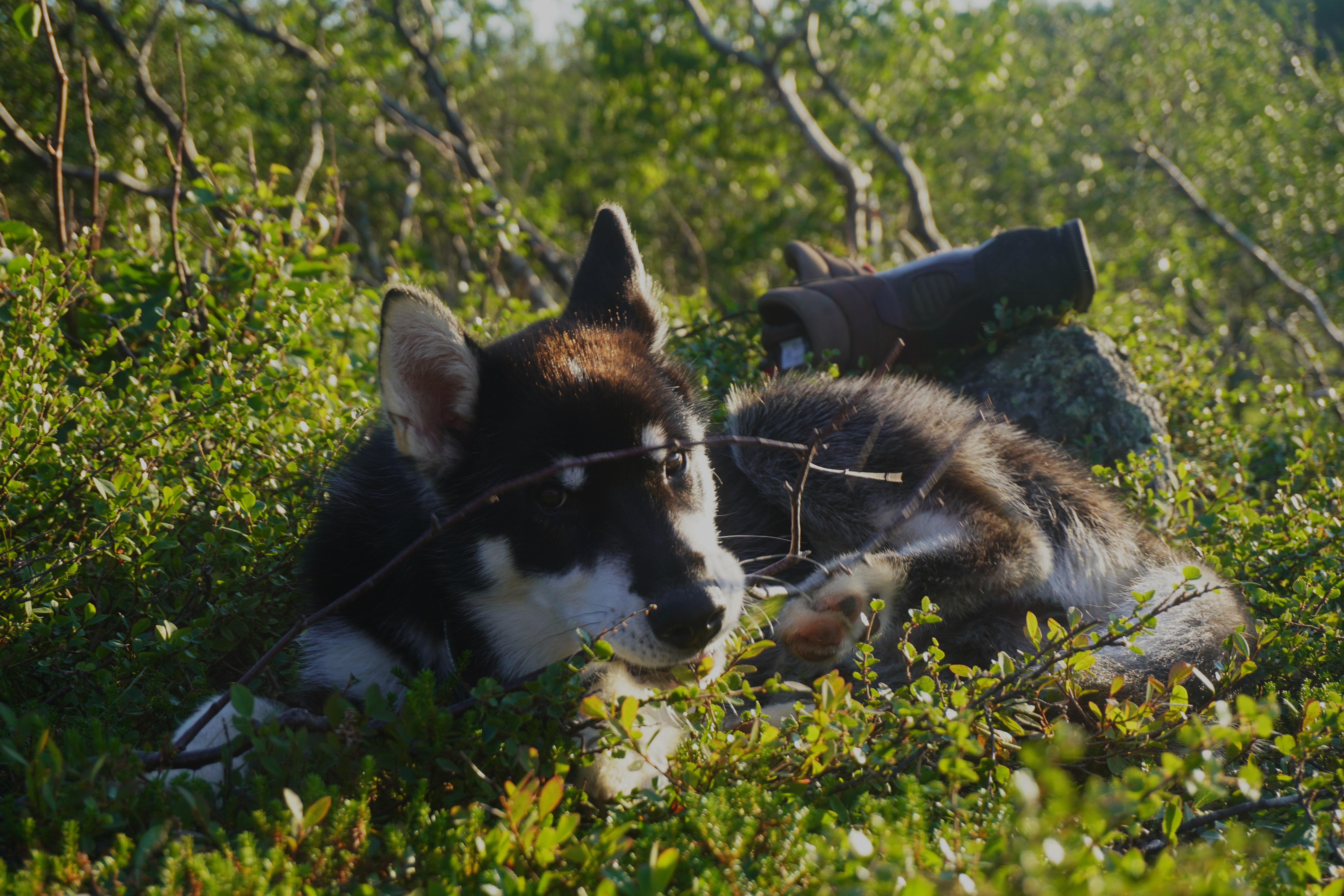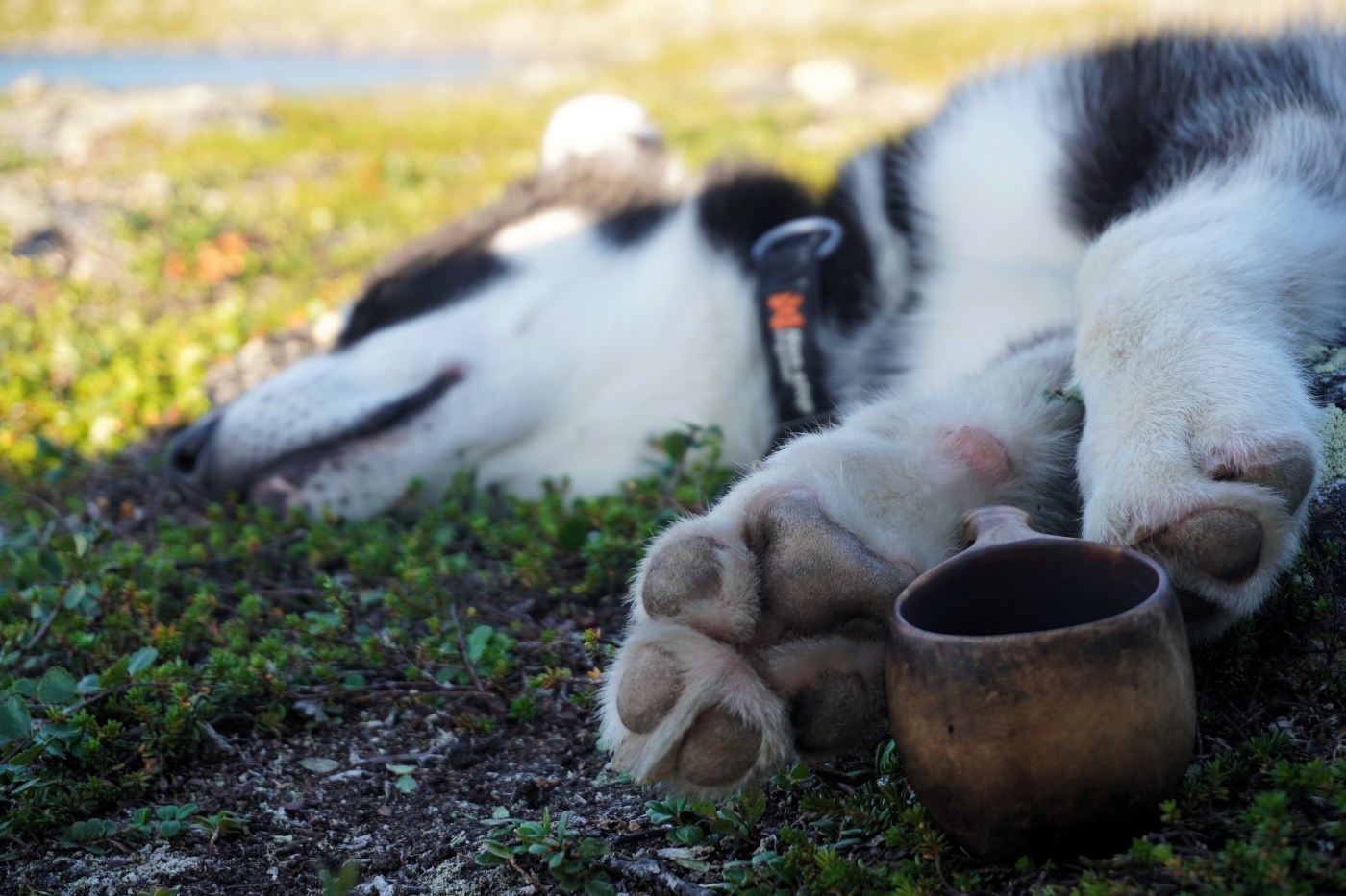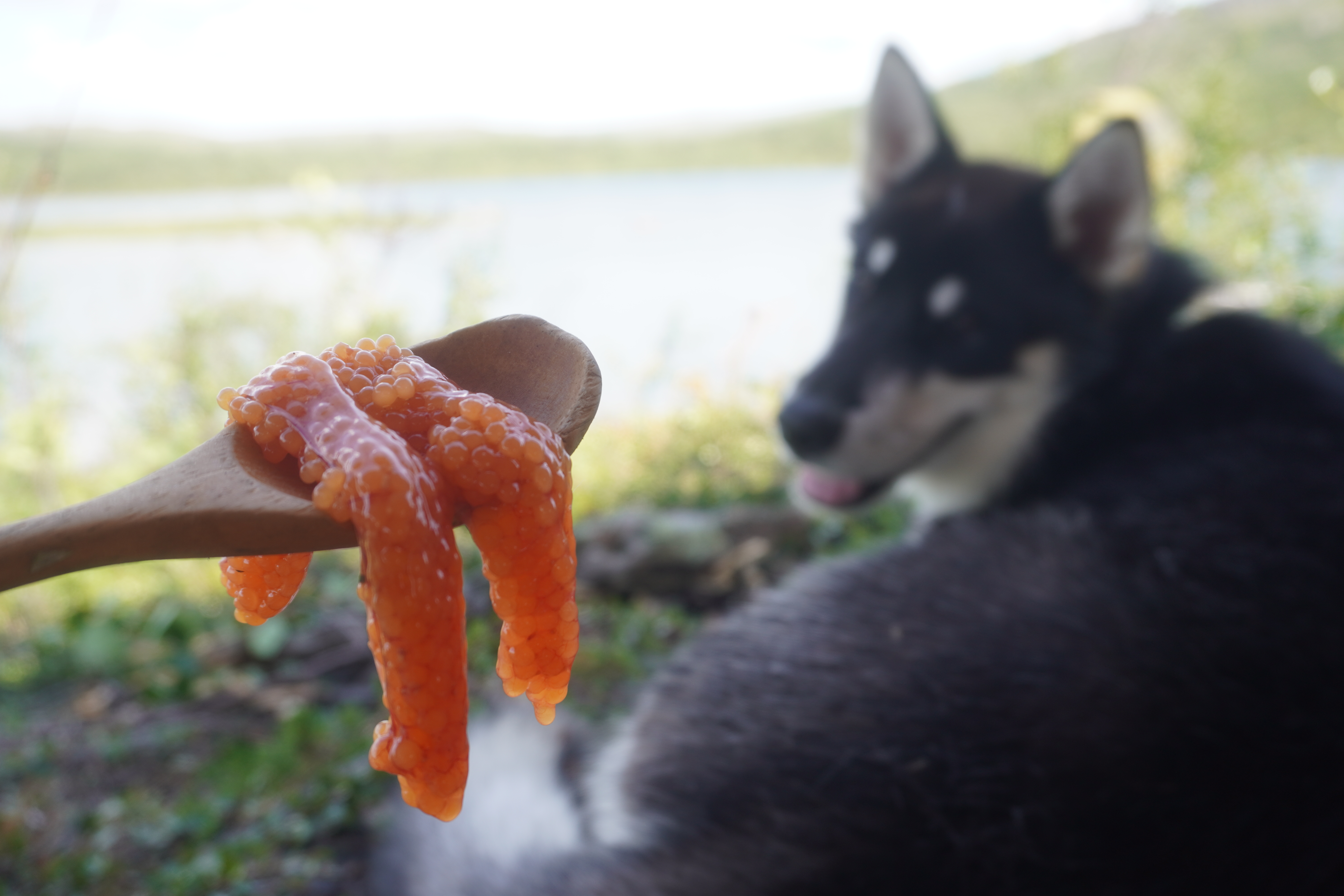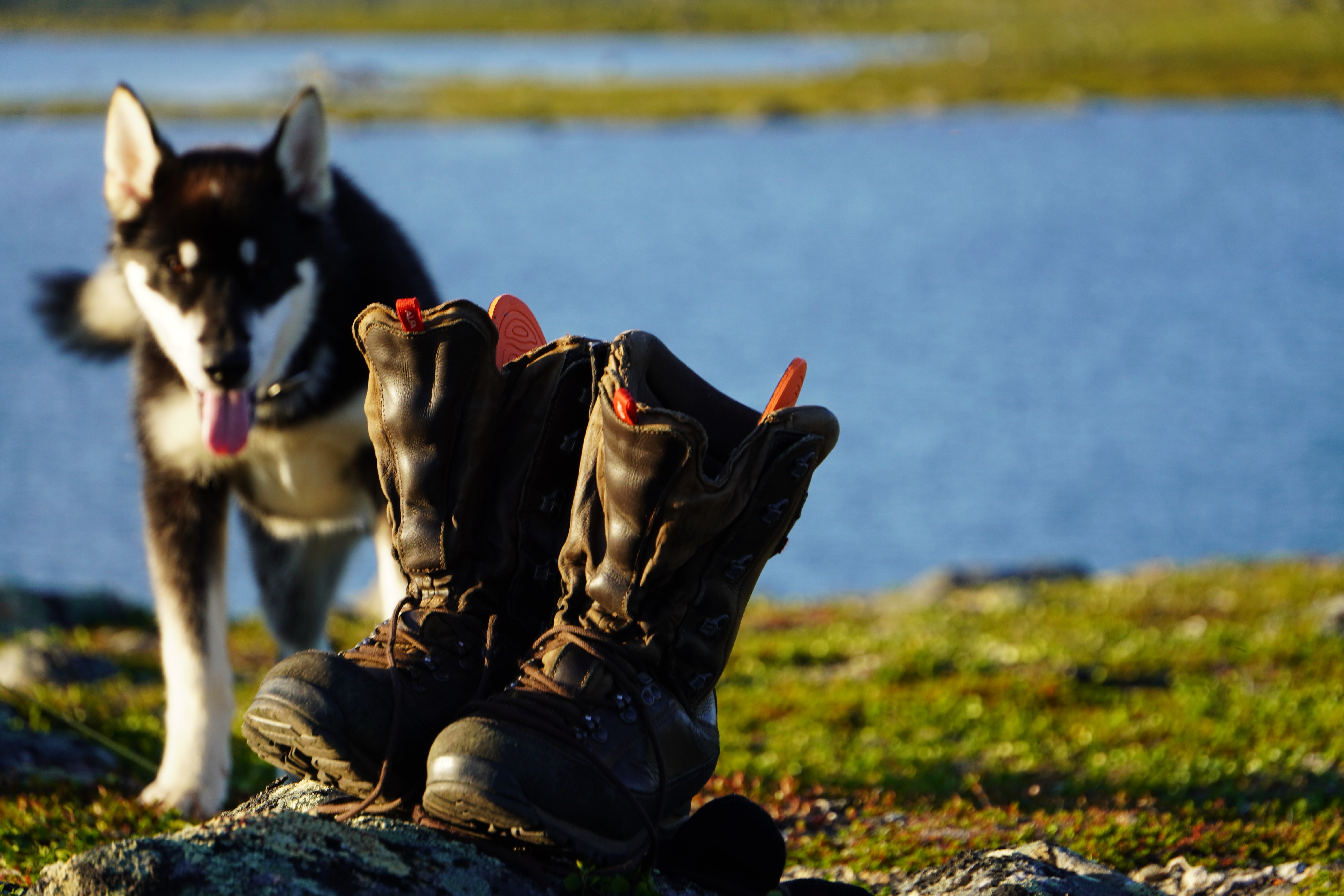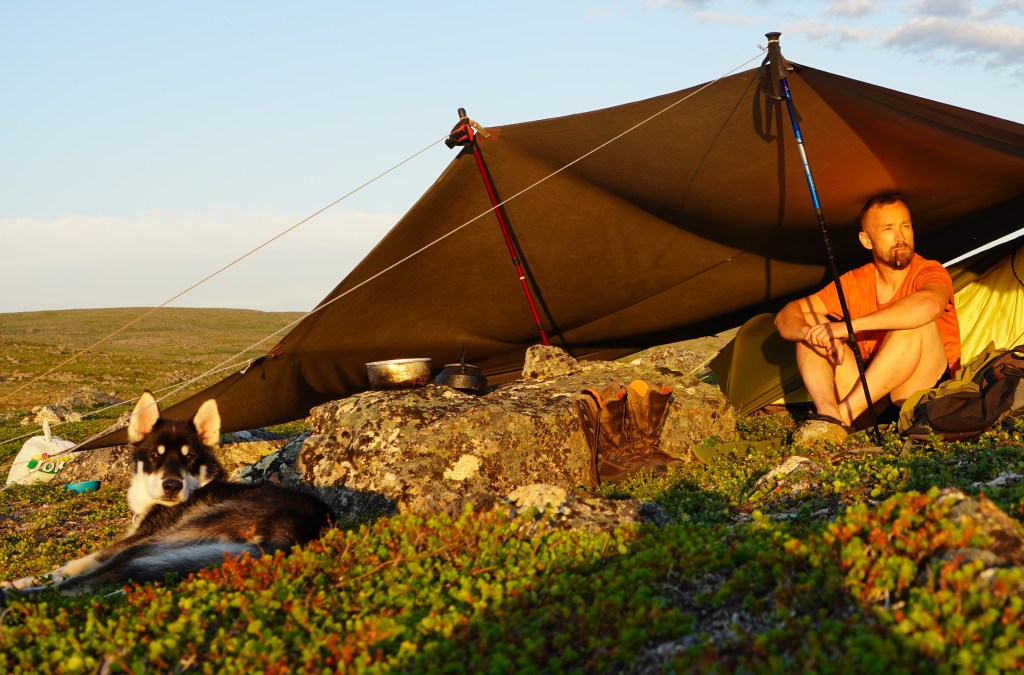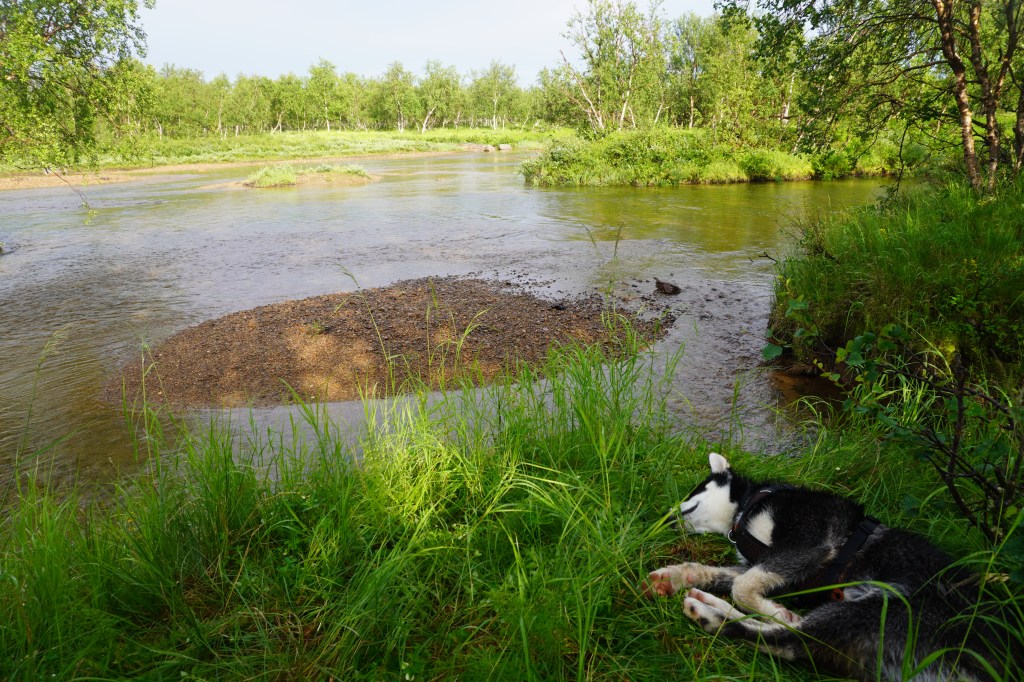 For en råtass og fenomenal liten kamerat å vandre vidda med. Han er skapt til dette livet. Sterk, utholden og tøff i kronglete terreng, og ved kryssinger av til dels ganske store elver. Han bauger på uten å nøle. Etter en nærmere 25 kilometers etappe har han fortsatt energi til å løpe litt etter fuglene som han aldri rekker. Naturligvis litt tyngre i steget enn ved etappens start. Han spiser multer og blåbær, gnager på reinbein og gevir, røtter og annet spennende som måtte by seg. Så er han heller aldri langt unna. Kun når han heller ville hvile i leir, enn å være med far på fiskerunde. Han dilter ellers ubekymret rundt, nysgjerrig på naturen og dét den har å by på. Han bader i vann, og hviler når han kan. Ved et par anledninger har jeg tatt ham inn i innerteltet. Ellers sover han utenfor – han trives godt under duken jeg har spent ut over teltet. Noe langøret har han av og til vært, dersom en rype, noen småfugler eller en ung fjelljo har vist seg spennende. Jakten er alltid resultatløs. Og ellers kommer han alltid på innkalling. Neste sommer byr nok både på kløv og bånd, så han får enn så lenge nyte sin frihet som valp. Men du verden for en hardfør og trivelig kar å ha med. Det er lett å la seg imponere over grønlandshunden.
