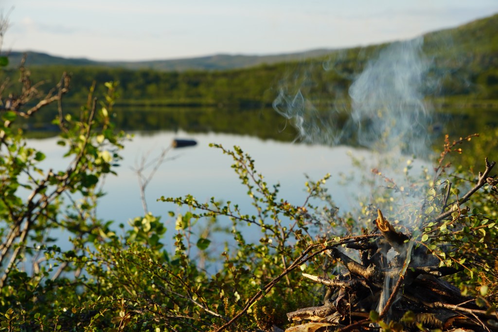 Den andre dag våkner vi opp til fantastisk sommervær. En sval bris fra sørlig retning rusker lett i bjørkekronene rundt leiren. Jeg setter i gang gassbrenneren og koker opp en kjele kaffe som skal nytes i skyggen under duken. Skodde fikk sove i teltet i natt for å slippe unna den verste myggen. Dagens plan er å ta det med ro i leir. Hvile, rusle litt rundt i nærområdet med fiskestangen og kanskje fyre et kveldsbål.