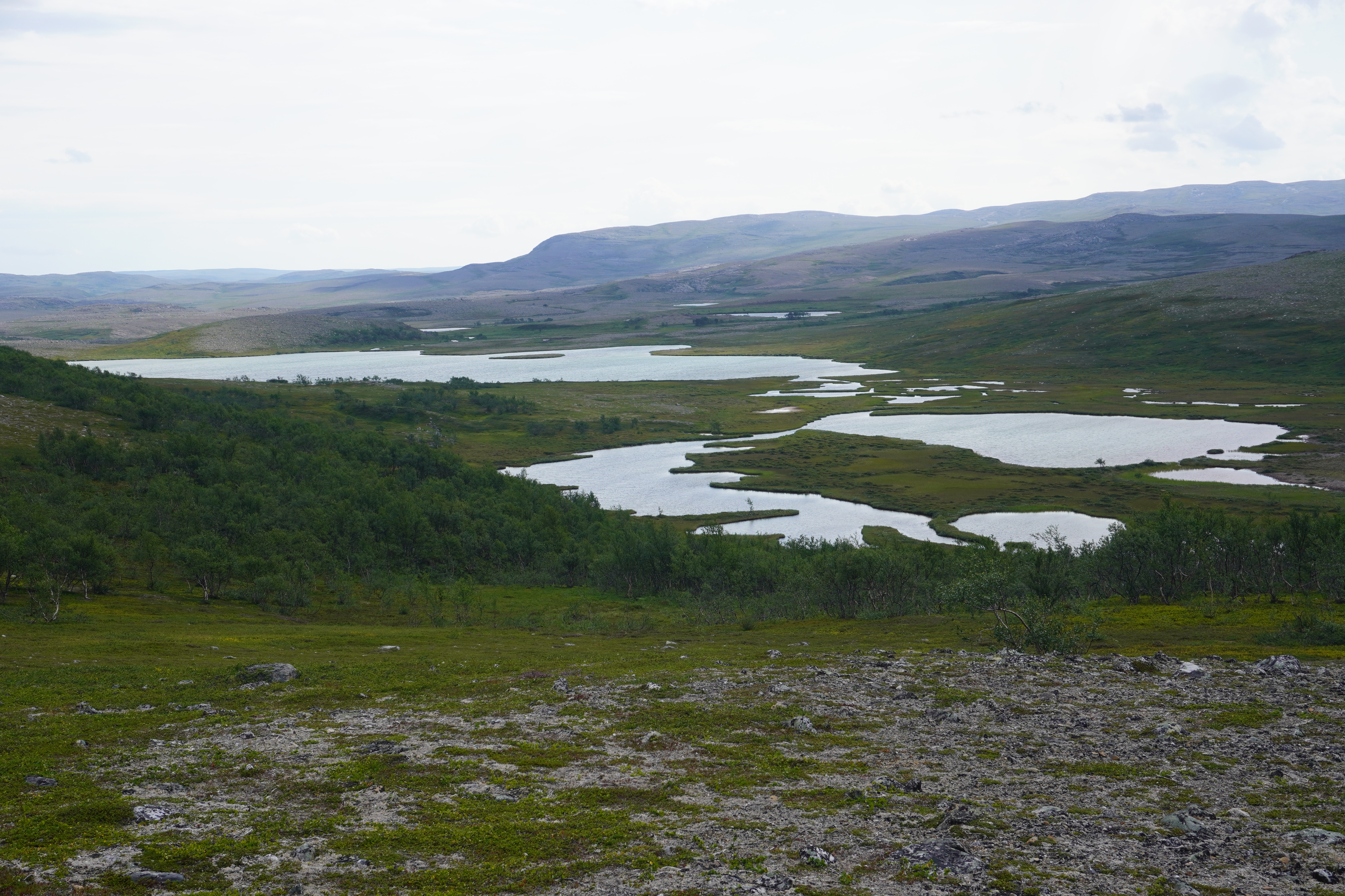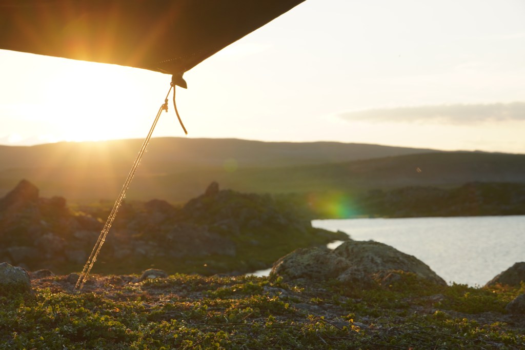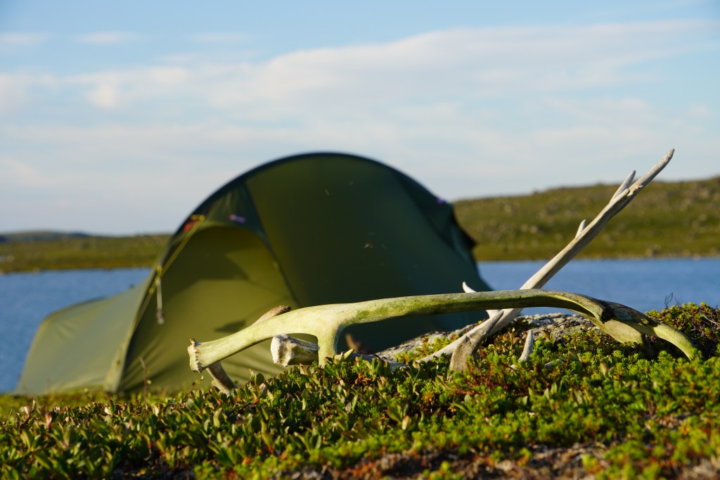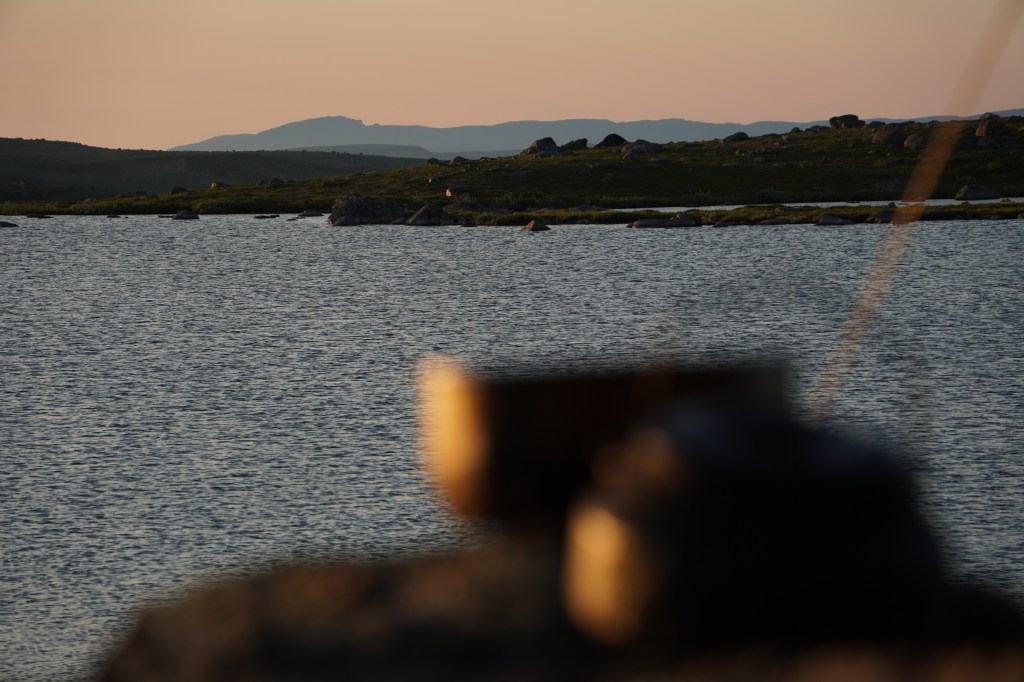Det har blitt tredje dag og leir nummer to. Omkring oss har landet endret seg. Selv om vi fortsatt befinner oss under 400 høydemeter over havet, er vi ikke lengre omgitt av finnmarksbjørk. Nå er det vidsynt horisont over et landskap uten høyreist vegetasjon. Landet domineres av lyng, morenerygger og storstein. Finslipt og formet av et hardt klima gjennom tusenvis av år. Mot sydvest kan jeg se Rásttigáissa ruve mot himmelen. Fjellet som i den gamle samiske naturreligion var forbundet med sterke iboende krefter, og som sjamaner fra nord og sør kjempet om å kontrollere. Leirplassen er lagt på en morenerygg for å få best mulig utnyttelse av den sørlige vind som stryker over vidda. Rundtom blinker fiskevannene.