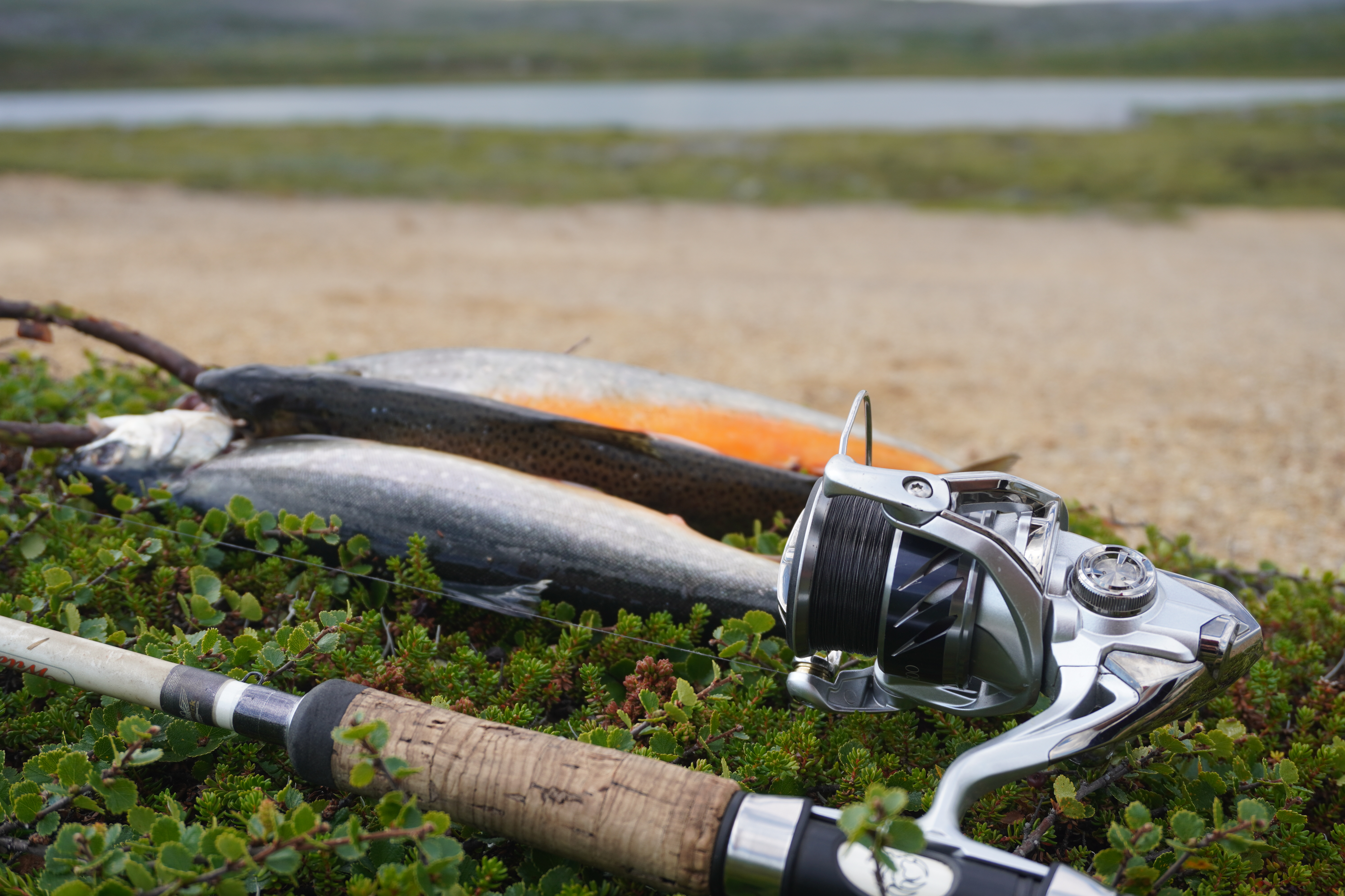 Vedrørende fisket i vannene her er det en treg affære. Etter at den friske sørlige vind har roet seg litt utpå kvelden, tar jeg en god runde med stangen. Det oppstår en del vakaktivitet, og den større fisken ser ut til å oppholde seg godt utenfor rekkevidde fra land. Bettet er svakt i det varme vannet. Jeg opplever flere hugg, men fisken krokes ikke skikkelig. En større fisk sliter snøret. Trolig har jeg slurvet med å etterse multisenen, som er flisete på den nederste halvmeteren. Ergerlig. Til slutt lander jeg en ørret og en røye, akkurat store nok til å utgjøre et solid måltid sammen med potetmos og sennepssaus.
