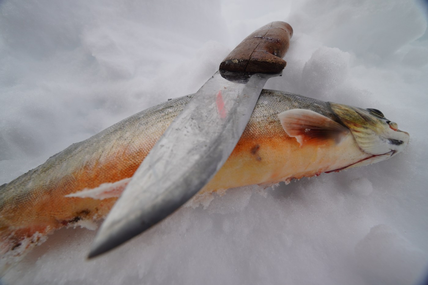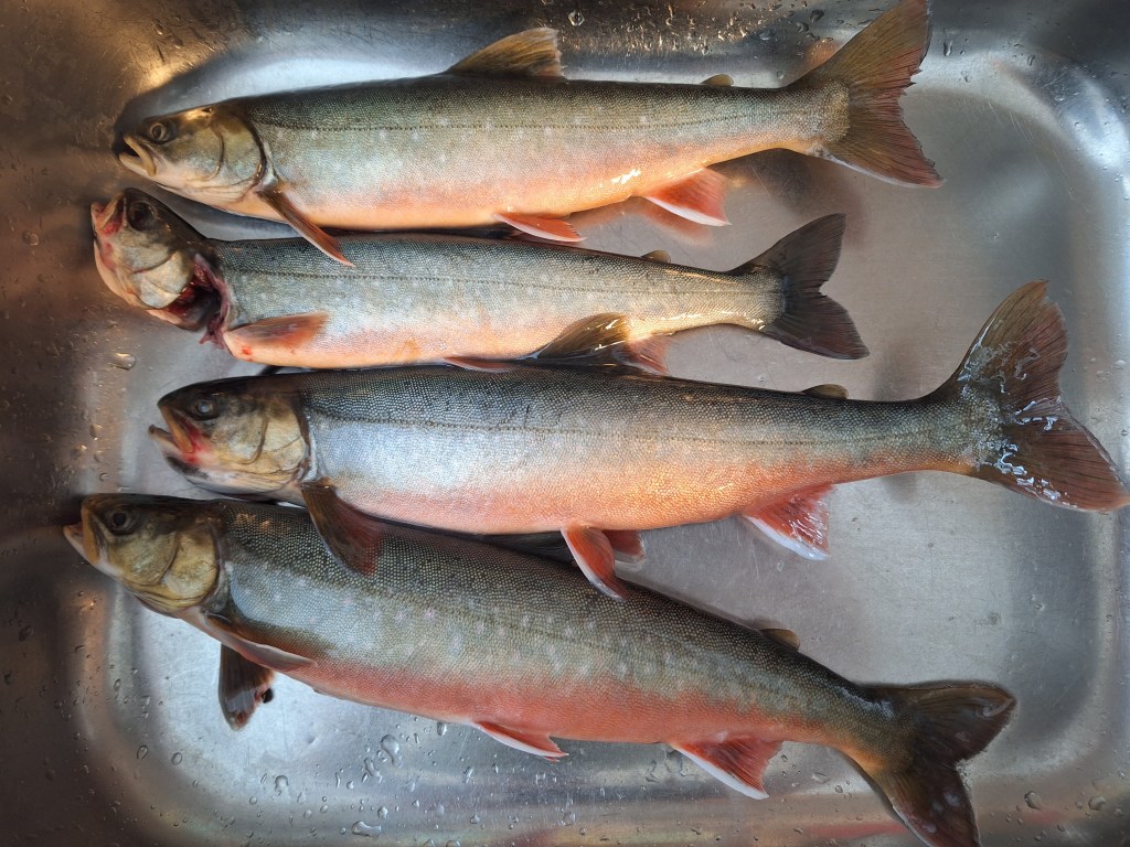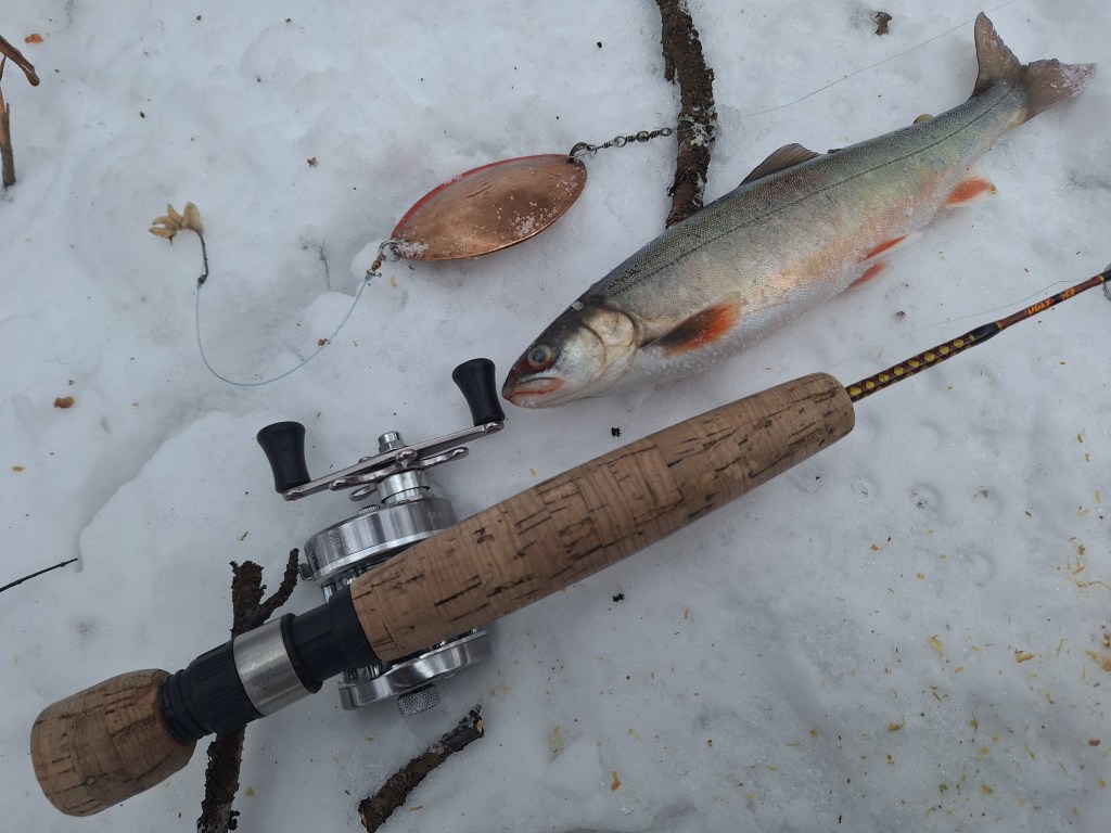 Et pent knippe sniker plasseres ut i vannet, og vi fisker også aktivt i de perioder når vær og forhold lar oss friste utpå. Selv uten levende agn som maggot og mark, landes fire pene røyer opp i halvkilos størrelse. Alle som én lot seg lokke til hugg av kroker egnet med elgfett.