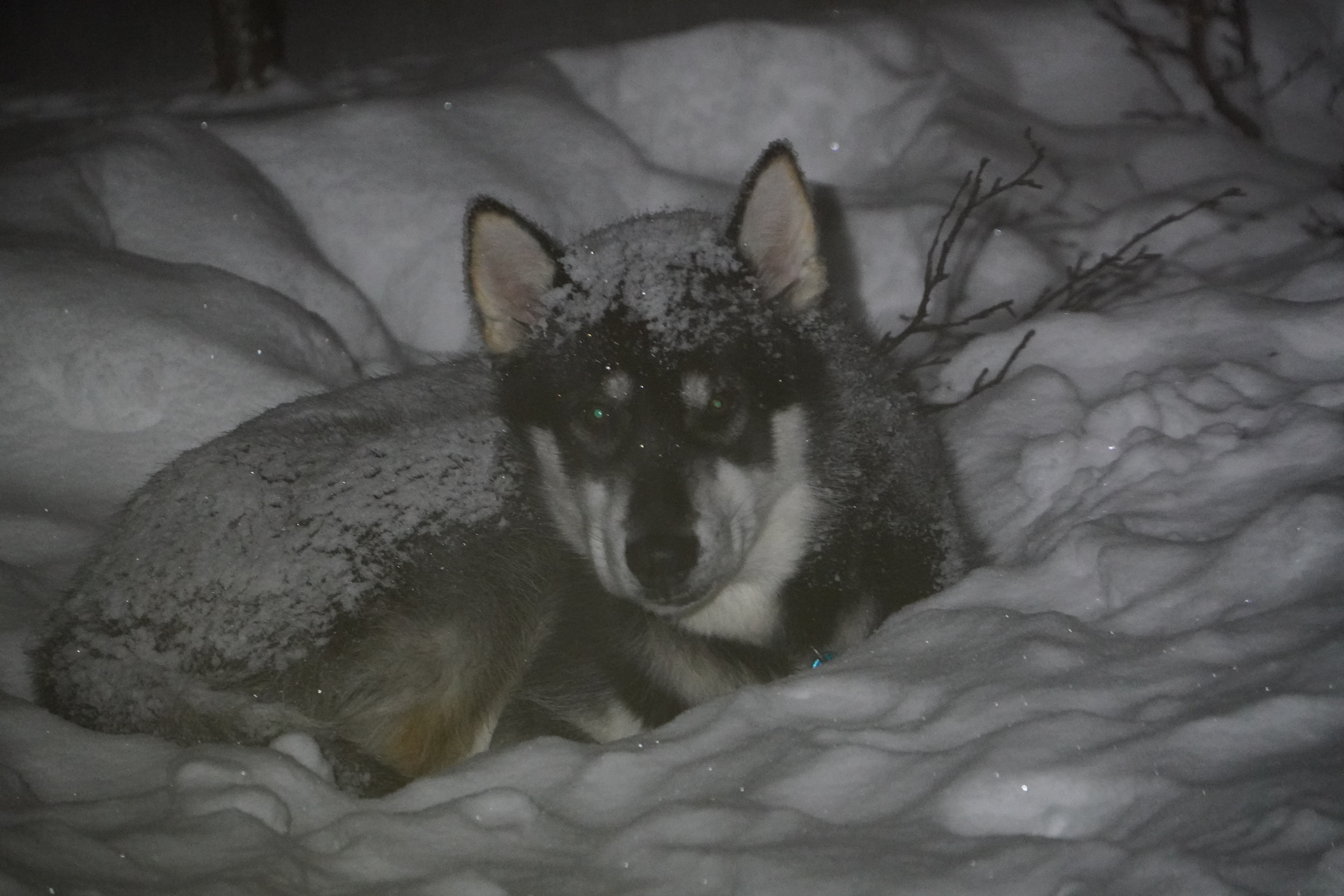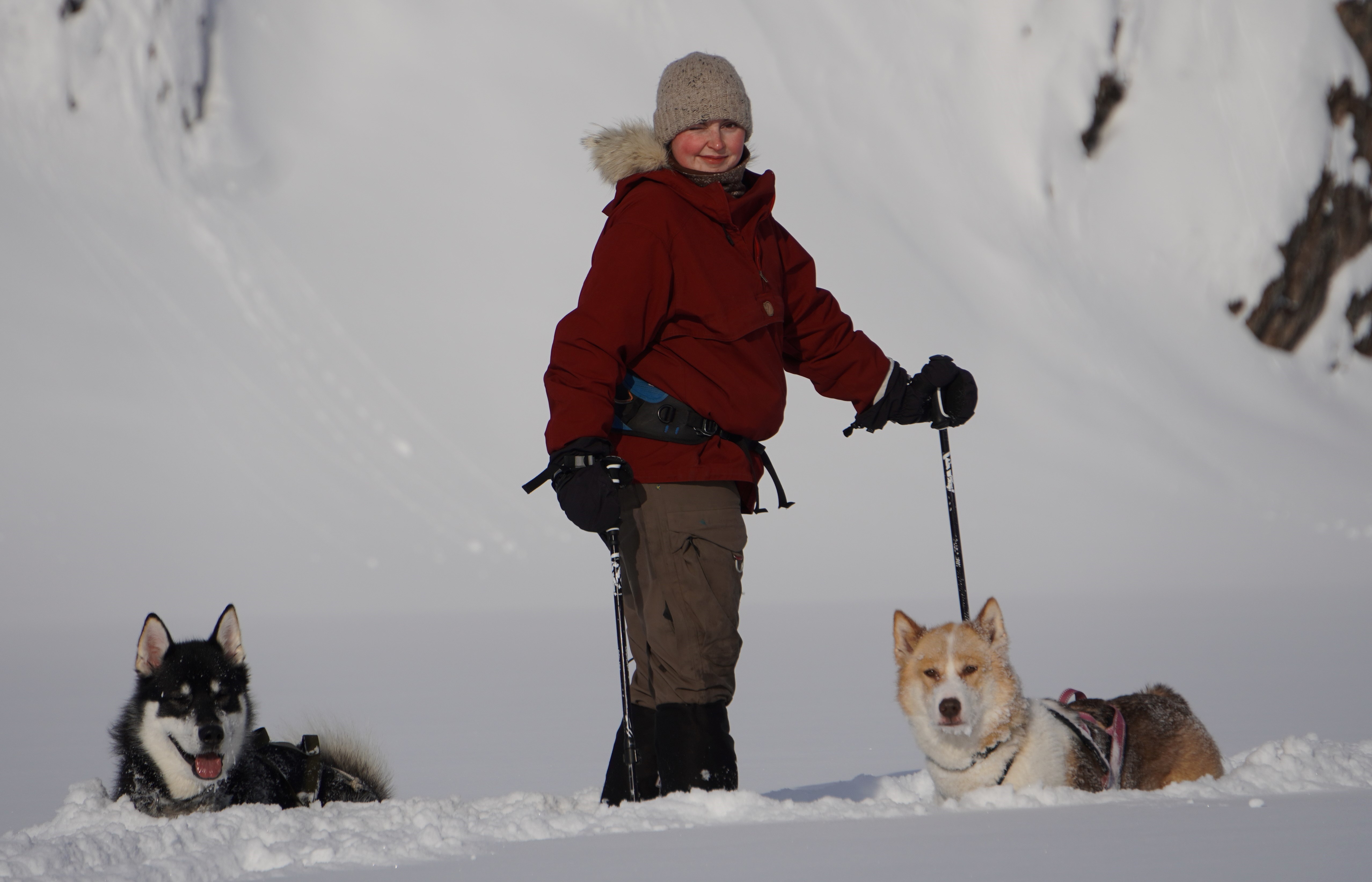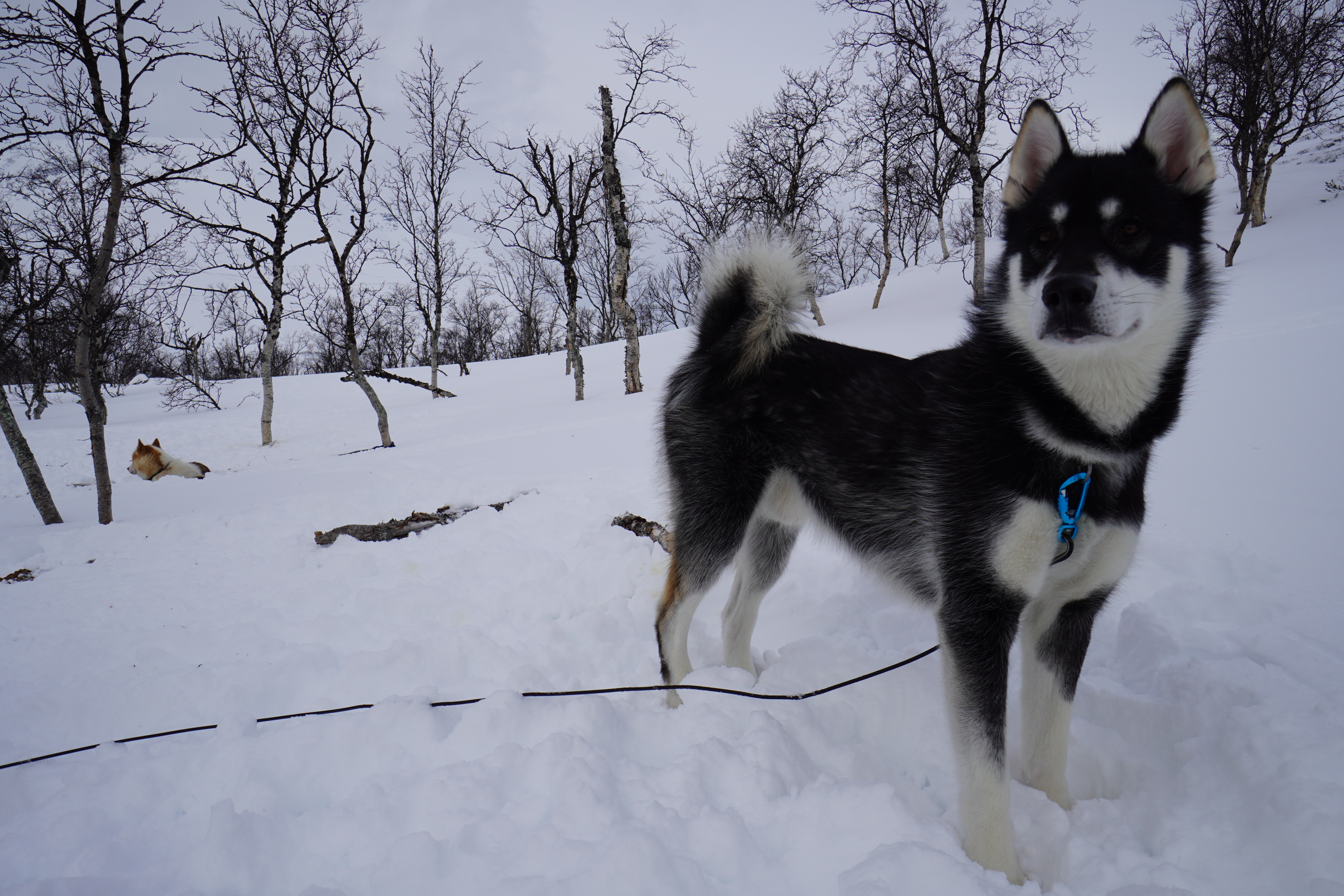 Vi får noen godværstimer den andre dag, og lar den utnytte til en skitur med bikkjene i landskapet rundtom. Så slipper himmelen løs sine nedbørssystemer, og vi våkner opp til at telt og bikkjer er dekket av en ikke ubetydelig mengde tørr og løs snø.