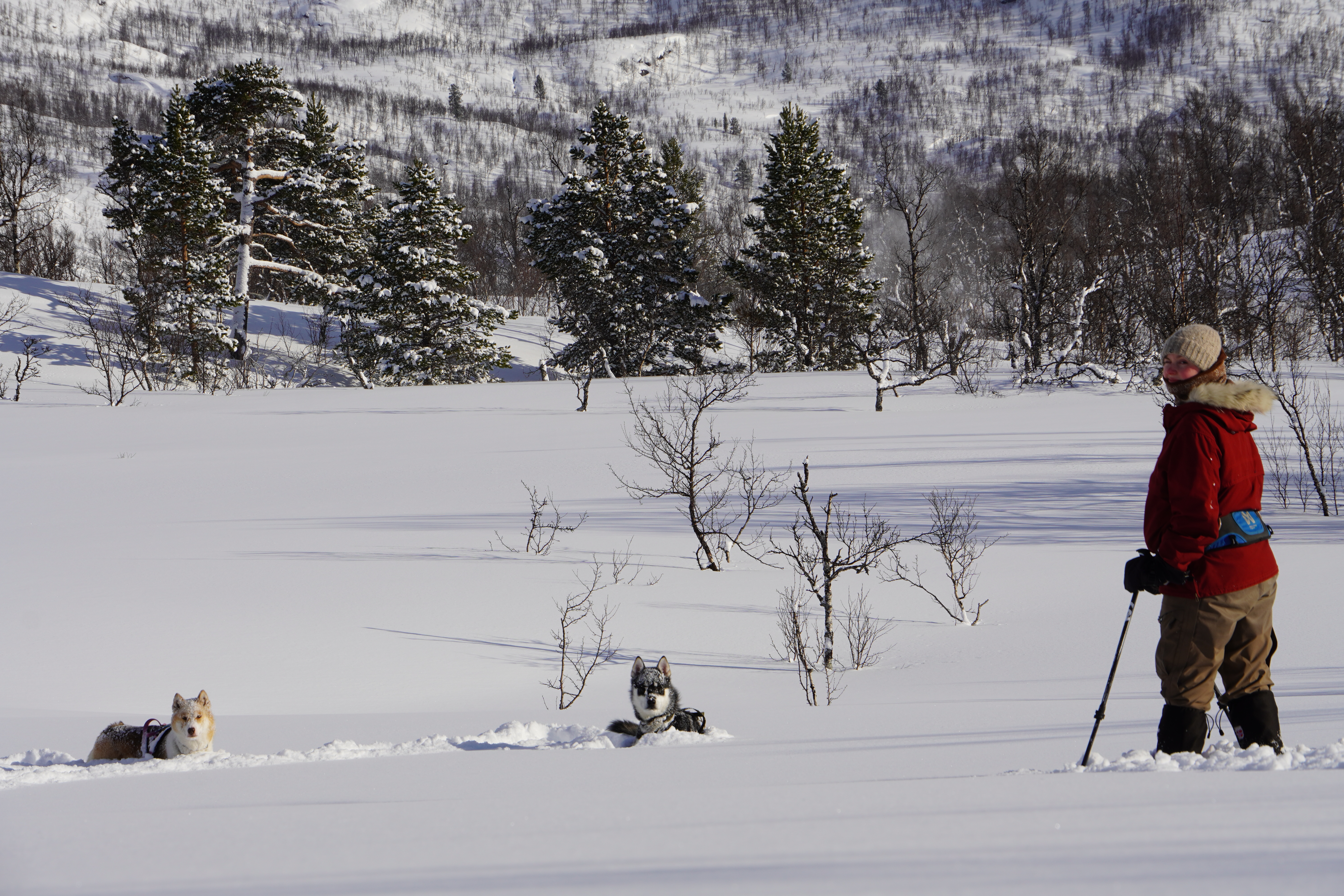Her i Målselv er vi tilgodesett mengder av relativt lett tilgjengelig nærnatur med lune skoger en kan stikke seg bort i. En januarhelg kurser vi derfor mot Fjellfroskvatn, en av de litt større sjøene i indre Troms. Med grønlandshundene i front pigger vi oss med tungt lastede pulker over den glaserte is. Vi har ingen annen ambisjon enn å bo i telt, fyre primus, ete, lese, kanskje bore et hull eller to i isen og stikke ut med bikkjene i landskapet rundtom. Sameksistere med landet under polarhimmelen.