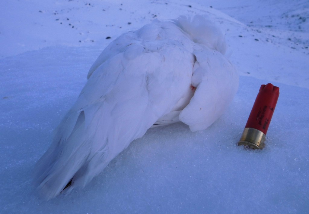 Oppover langs en rimelig bratt fjellrygg bærer det nå. På begge sider av ryggen ligger det fiskevann som huser sågar røye og ørret. Vi jakter på kryss og tvers innover ryggen, og det går ikke lang tid før ferske fjellrypespor og avføring oppdages. Skodde trekker meget bestemt i en retning, og jeg velger å følge ham. Vi runder en markant sørvendt berghammer, og på baksiden av den sitter fjellrypene. Fire av dem, der én ruller nedover skavlen etter et hardt smell av kaliber 12. Den rakk aldri å lette. Det skulle ikke bli mange flere vi fikk se av Lagopus Muta, men nok til at én mulighet til skulle by seg. Akkurat idét vi er på tur å skli oss nedover en renne som fører ned mot bjørkeskogen igjen, fyker en trio skarrende fjellryper ut fra en bratt berghylle mot høyre. Skudd nummer én er bom, mens det andre sender siste fugl i gjengen ned for en skur i haglestørrelse 5.