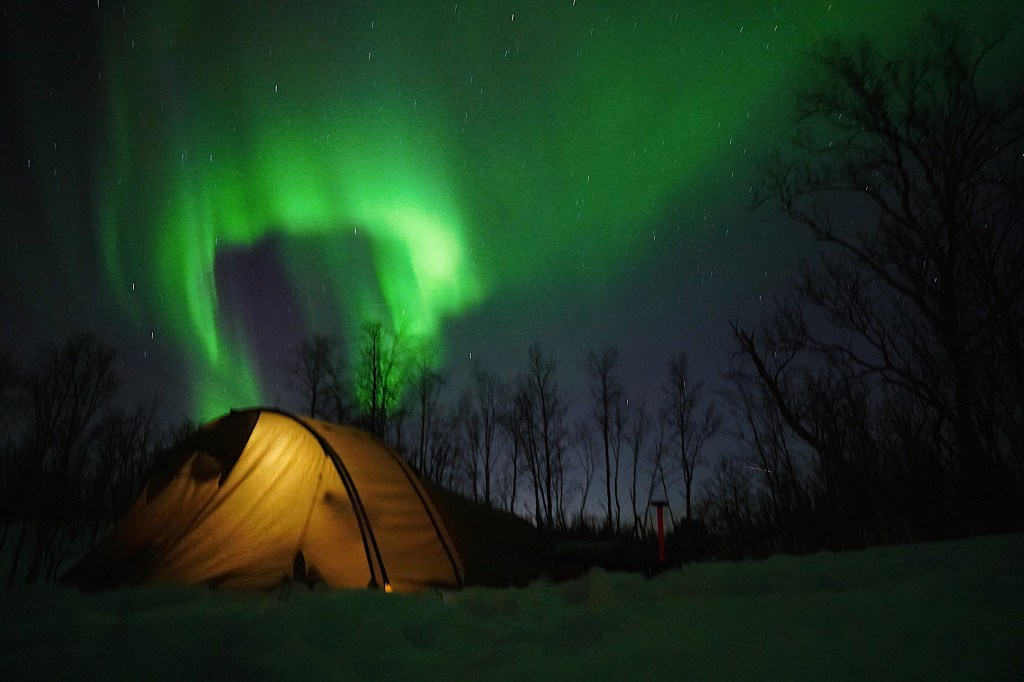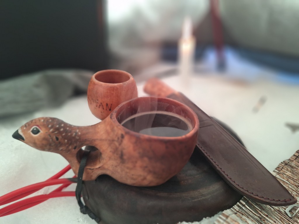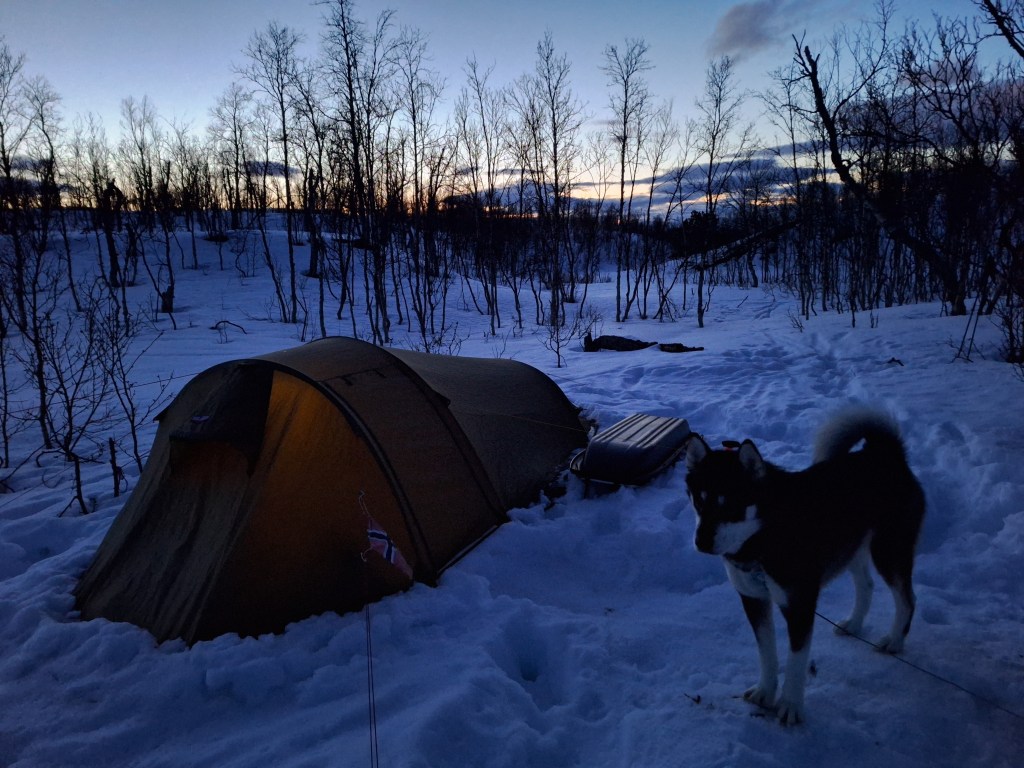 Ikke altfor tidlig neste morgen strekker jeg meg fra soveposen etter fyrstikkene, fyrer opp primusen og slenger kjelen over. Utenfor ligger det sammenkrøllet en trøtt firfoting, som lett logrende konstaterer at glidelåsen åpner seg. Det er overskyet, luften er mild og knapt i bevegelse. Etter noen kopper kaffe og ytterligere lesing på morgenkvisten, er det på tide å hyre seg for en dags jakt. Med lirypene like rundt teltet er det bare å legge patronene i haglegeværet med en gang.