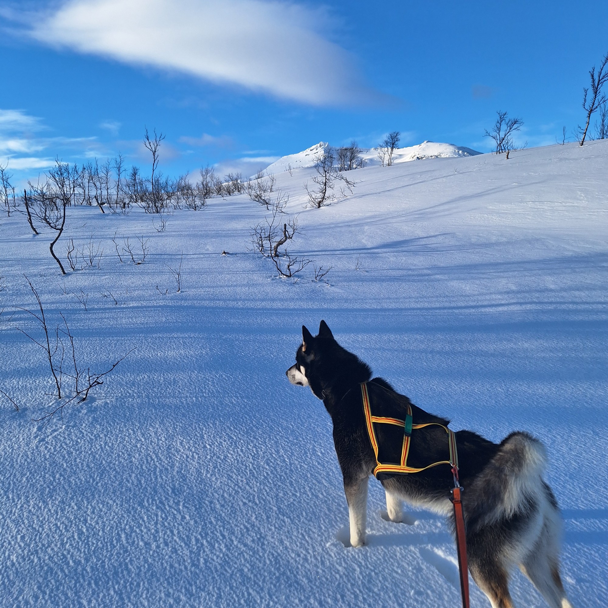 Skodde kobles i magebeltet, og vi begir oss i vei. Det er noe krevende forhold i fjellbjørkeskogen som omgir leiren. Såpass mildt har det vært de siste dagene at det ikke er all verdens til såle. Skodde må derfor jobbe til dels hardt fior å ta seg frem. Han går en del gjennom. Det blir bedre når vi kommer litt høyere opp, men der er til gjengjeld snøen kaldere, og det klabber kraftig under helfellene. Derfor holder vi oss relativt lavt hele turen. For det meste nedenfor krattbeltene og delvis i bjørkeskogen. Vi både ser og hører ryper, dog er de leie å få på hold. De hører oss tidlig og går for det meste på vingene før vi er innenfor akseptabel skuddavstand. Ikke før mot slutten av turen får jeg to sjanser som ender med bom. Det er heller ikke alltid en enkel affære å levere greie skudd når en ivrig ung grønlandshund på 40 kilo rykker i selen når rypene skvetter fram.