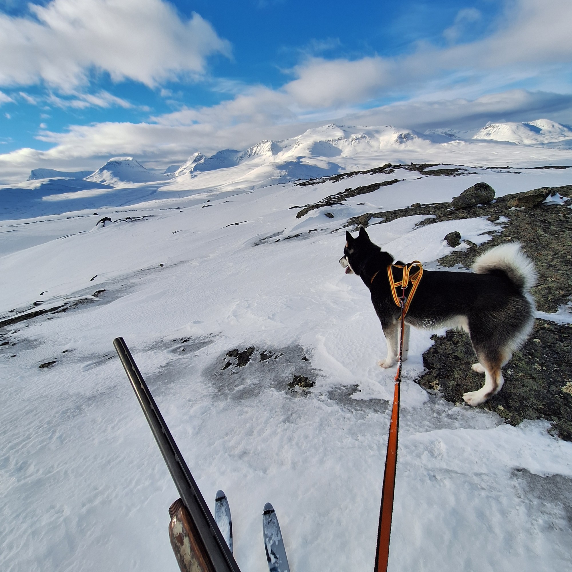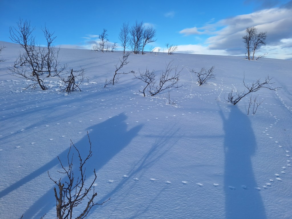 Neste dag tørner vi ut til fenomenalt vær. Morgensolen lyser fjellene opp, og det har kvesset på med litt frost i løpet av natten. Derfor er føret langt fastere og bedre overalt. Vi glir lett fram mellom busker og kratt. I dag har jeg valgt en litt annen og høyere rute enn i går. Har siktet meg opp mot et fjell på omlag 800 høydemeter for å se etter fjellryper. På tur dit jakter vi oss gjennom mye interessant lirypeterreng. Ser både spor, ferske rypedokker og fugl i luften. Det er også ferske revespor å se. Mikkel har lusket langsmed krattbeltene, trolig på søken etter ryper i dokk. Ett sted ser jeg et enslig, men ferskt rypespor som forsvinner bak en bjørkelegg i underkant av en morenerygg. Når vi nærmer oss, strammer Skodde seg markant opp, og en lirypestegg fyker fram. Skuddet sitter som det skal, og steggen går ned. Så er det en egen idrett å gjøre det klart for grønlandshunden at viltet er mitt, og ikke hans. Det ender bra. Som belønning får han den ene foten. Noen knas mellom sterke kjever, og den er borte.