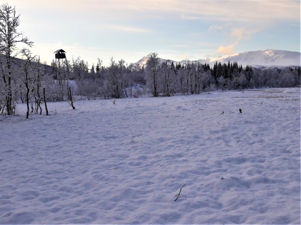 I en halvmeter puddersnø går det jevnt og rolig oppover skråningene. Tanken min er å gå i kanten av myrdragene, og kikke etter hare og hvite vinger i krattbeltene. Kommer jeg høyt nok i terrenget kan også muligheten for sittende fjellrype være til stede. Forholdene er perfekte for å se spor i den nattferske snøen.