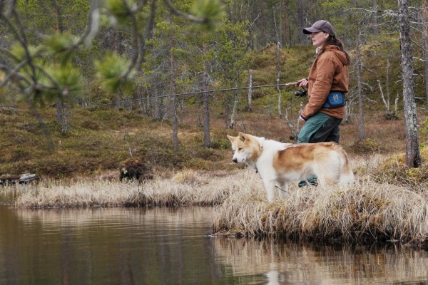 Vi stanser opp og fisker underveis. Ett sted kaster jeg målrettet på hoppende laks i brekket, og mister en stridig smålaks som tar på spinneren. Et annet sted, i en aldeles fenomenal kulp mellom klipper og berg, trekker Sunniva inn ny personlig rekord på ørret.